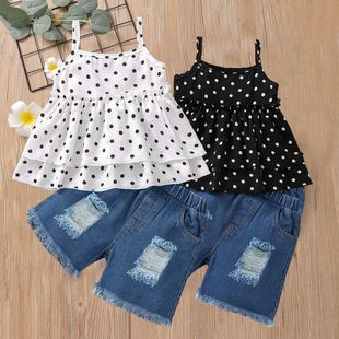 | 夏季女童装欧美中小女童夏季吊带圆点套装时尚破洞牛仔短裤童套装 |