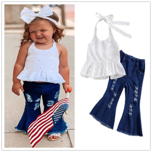 | 女童夏季套装2021新款缕空蕾丝挂脖童露背抹胸衣牛仔喇叭长裤套装 |