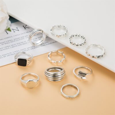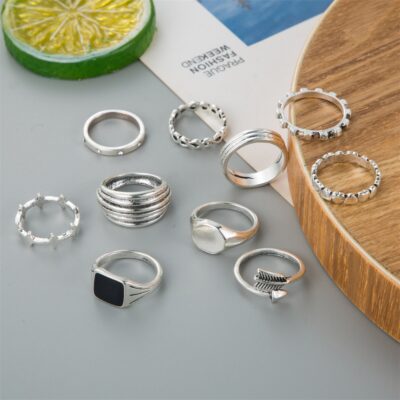 Bộ nhẫn quốc tế châu Âu và châu Mỹ 12 miếng phong cách retro punk bạc đen đá quý lá mũi tên mặt trăng doanh nhẫn