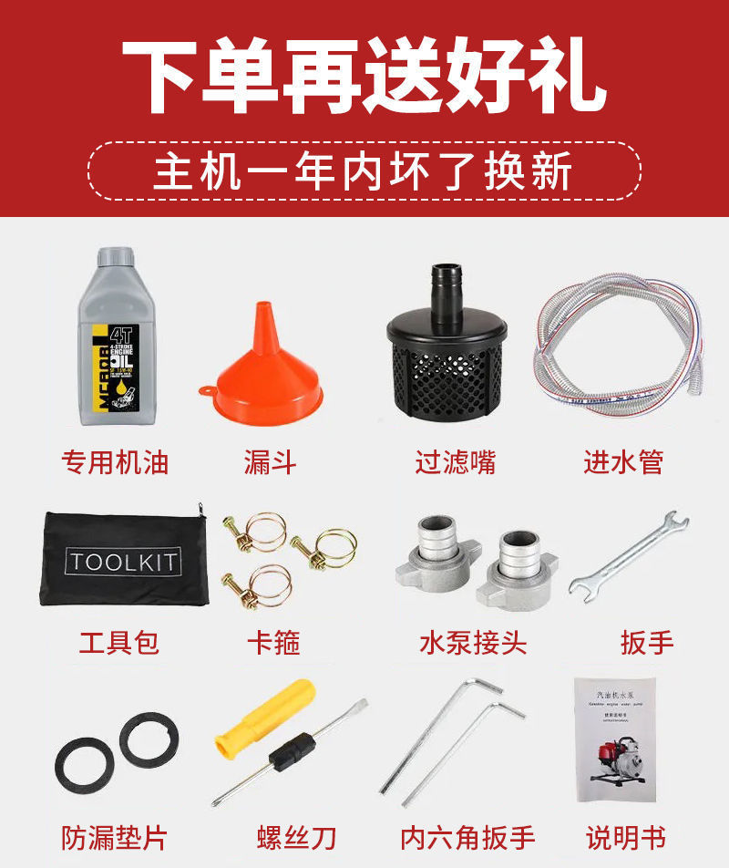 Thương hiệu: Qiandun Chất liệu thân máy bơm: hợp kim nhôm Thông số kỹ thuật: Máy bơm nước 4 thì 1 inch nâng cấp không có ống dẫn nước vào [trần trụi]/máy bơm nước 4 thì 1 inch nâng cấp + túi quà/nâng cấp 4 thì 1 inch + 10m ống + túi quà/nâng cấp Model bốn thì 1 inch + ống 20m + túi quà / nâng cấp máy bơm nước bốn thì 1,5 + túi quà / nâng cấp bốn thì 1,5 inch + ống 10m + túi quà / nâng cấp bốn thì 1,5 inch + Ống 20m + túi quà / hàng đầu bốn thì Máy bơm nước 1 inch + túi quà lớn / hàng đầu bốn thì máy bơm nước 1 inch + ống 10m + túi quà / hàng đầu bốn thì 1 inch + ống 20m + túi quà / hàng đầu bốn -máy bơm nước hành trình 1,5 inch + túi quà lớn/siêu hạm bốn thì 1,5 inch + Đai nước 10m + túi quà tặng/siêu hạm bốn thì 1,5 inch + ống 20m + túi quà/tàu thủy bốn thì 1 inch + ống 50m + quà tặng túi/flagship bốn thì 1,5 inch + ống 50m + túi quà tặng/kệ bơm nước 1,5 inch [không có động cơ] Ghi chú model / kệ bơm nước 1 inch [không có động cơ] nhớ ghi chú model / kệ bơm nước 1 inch [không có động cơ] nhớ lưu ý model Chế độ lái: xăng Lưu lượng tối đa: 10 Lực nâng tối đa: 10