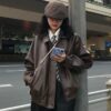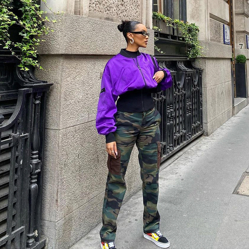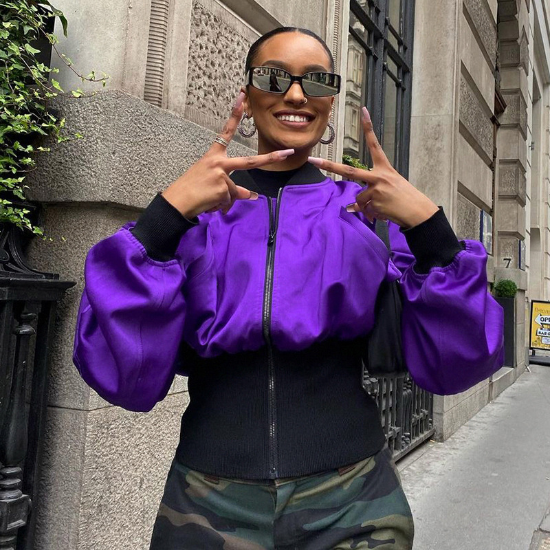 C25913 Mỹ thời trang đường phố thương mại nước ngoài của phụ nữ khâu màu sắc tương phản nhựa eo áo khoác rời dây kéo áo khoác cardigan mùa thu