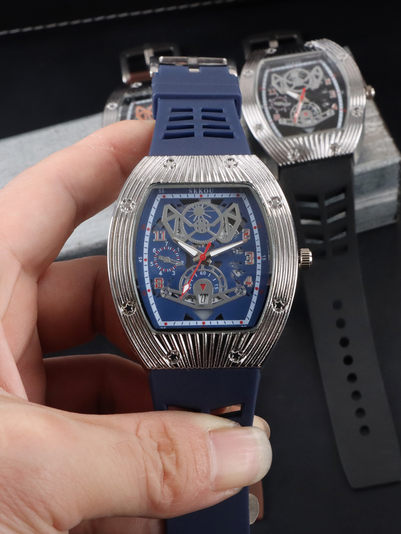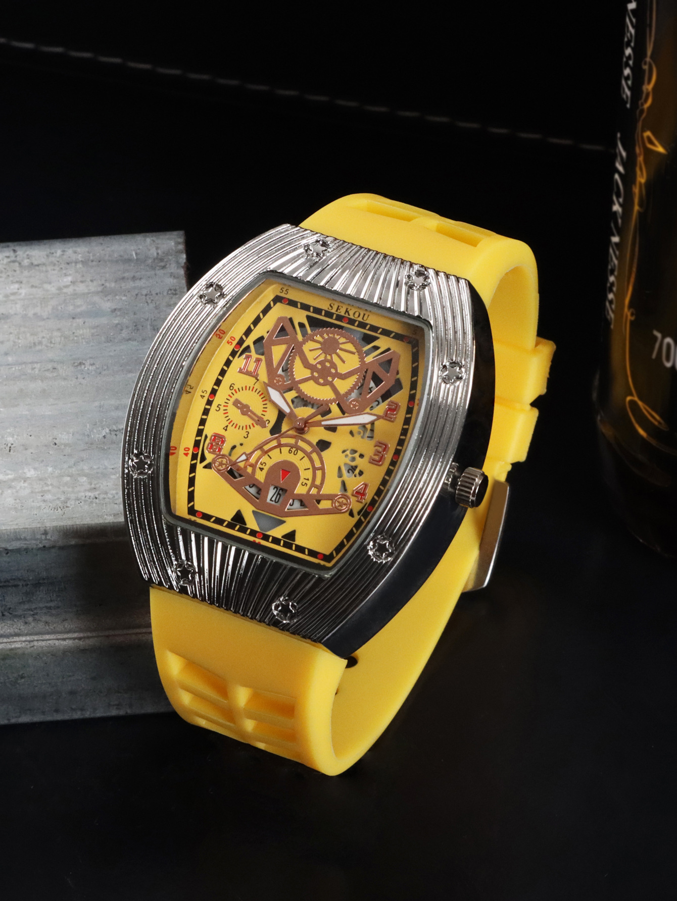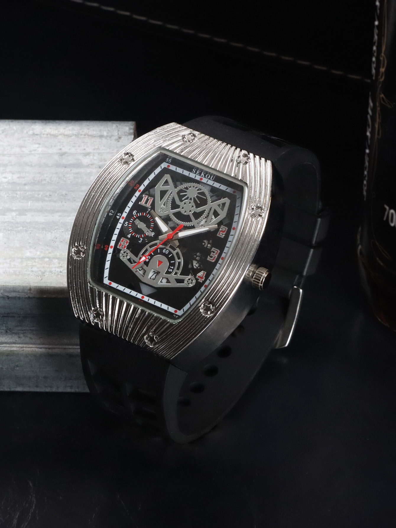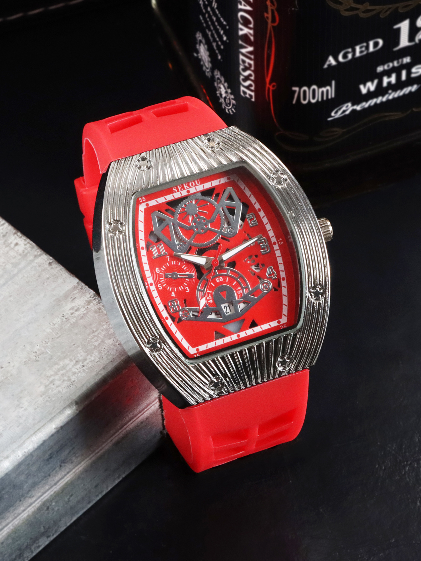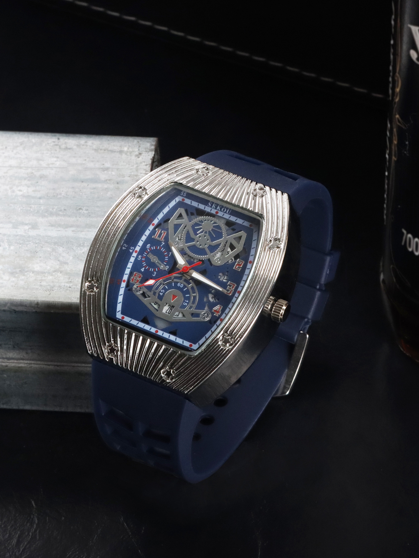 Cá tính hợp thời trang thời trang đồng hồ hình thùng thể thao nam phù hợp đồng hồ rỗng lịch dạ quang đồng hồ thạch anh JTX3