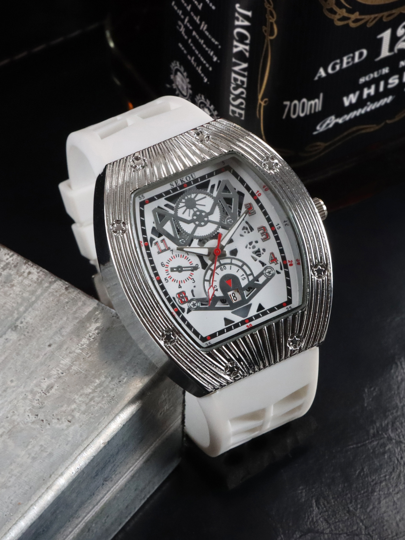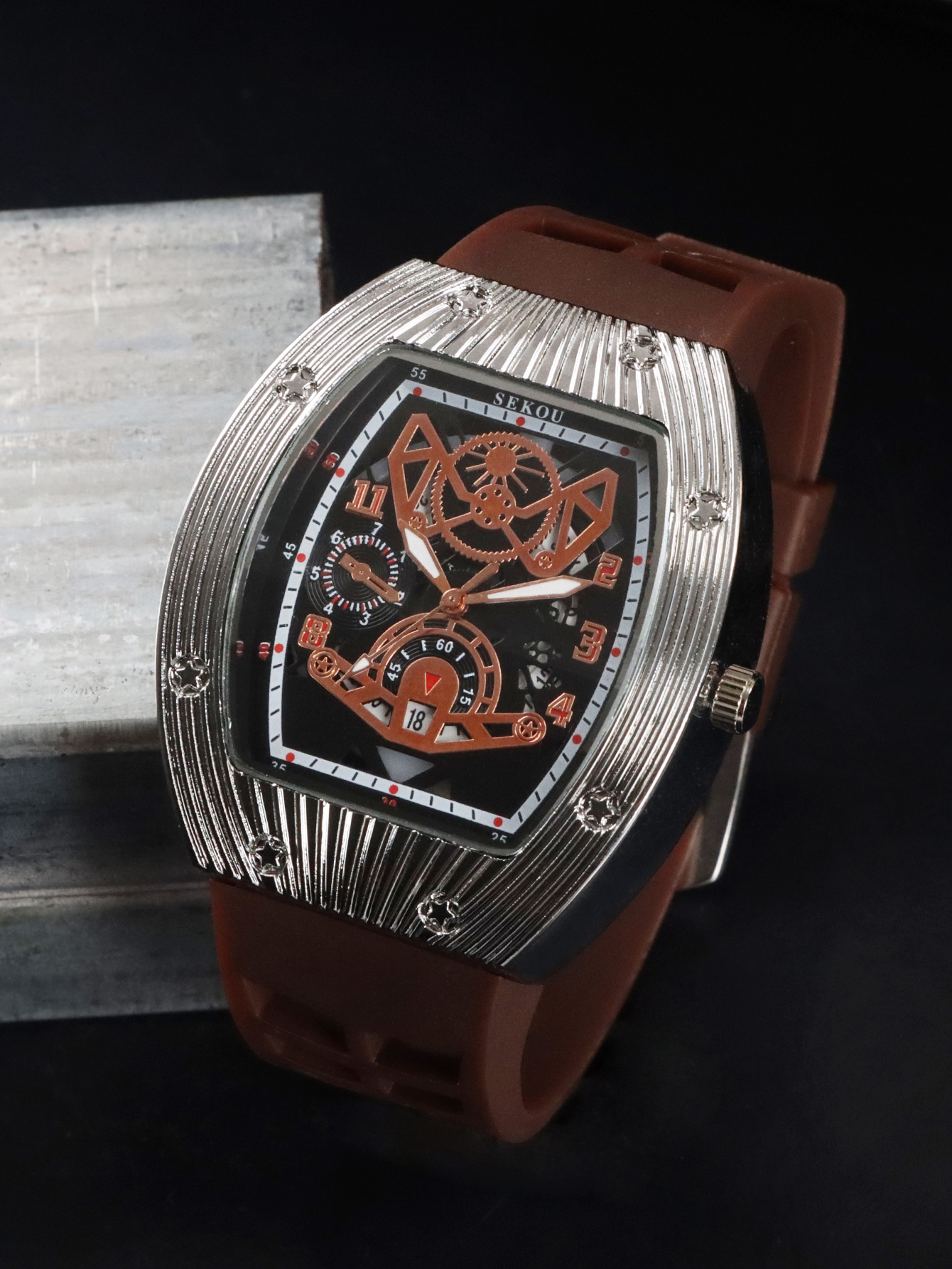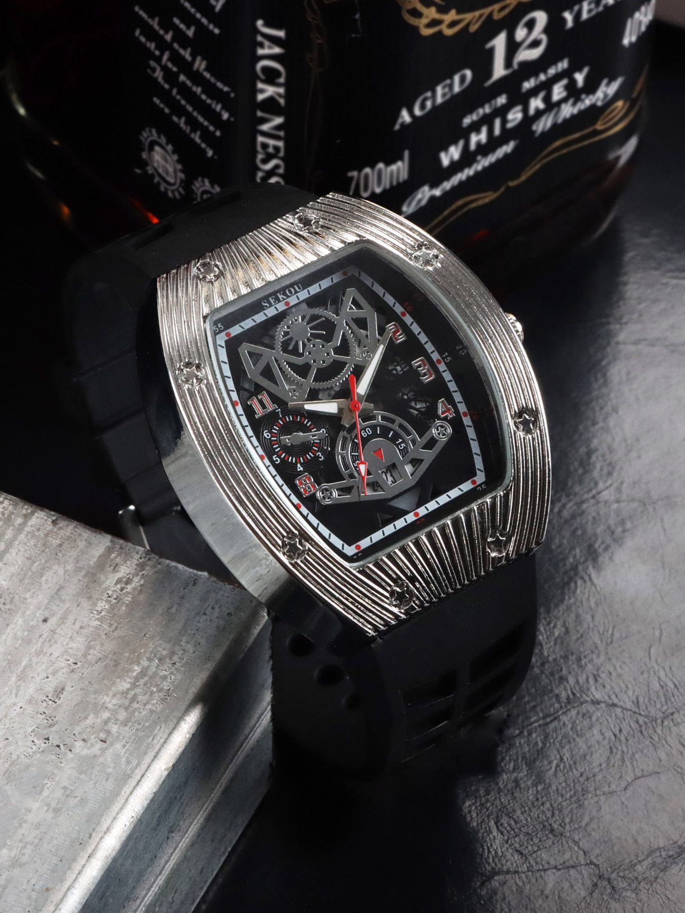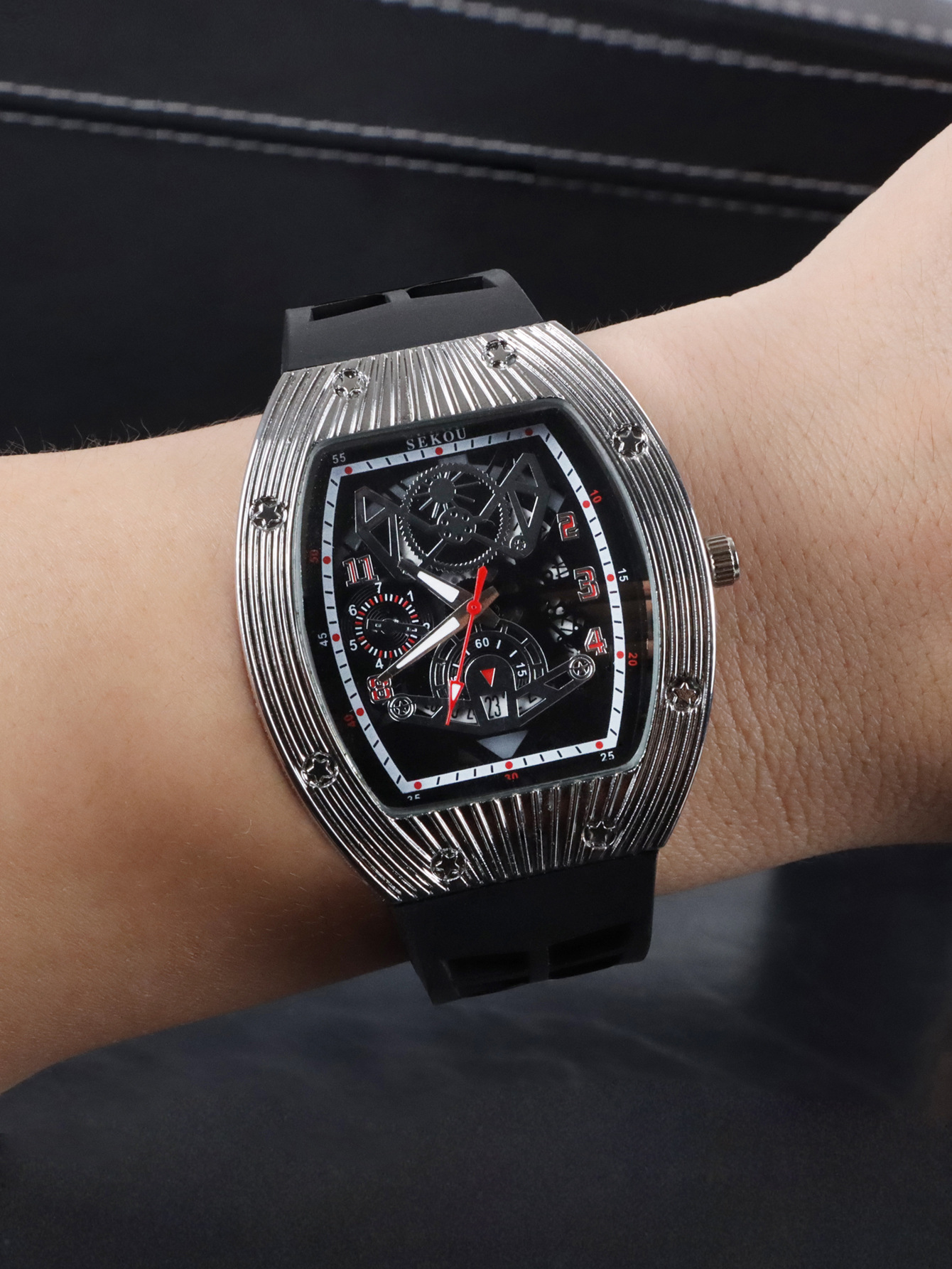 Cá tính hợp thời trang thời trang đồng hồ hình thùng thể thao nam phù hợp đồng hồ rỗng lịch dạ quang đồng hồ thạch anh JTX3