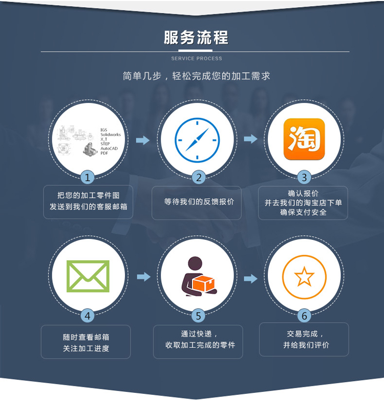 答: 我们的合作流程大体和平常网购一样,先传送加工图纸或者样品到我方,待工作人员进行评估计算,我们会尽快给出价位及加工时间,双方协商一致后,您便可以拍 下付款,我方按约定时间发货,收货后您确认付款,给出真实客观的评价。由于五金材料成本高,机械加工成本大,部分零件我们需要象征性地收取部分定金(具体 数额以及支付方式另行通知)。