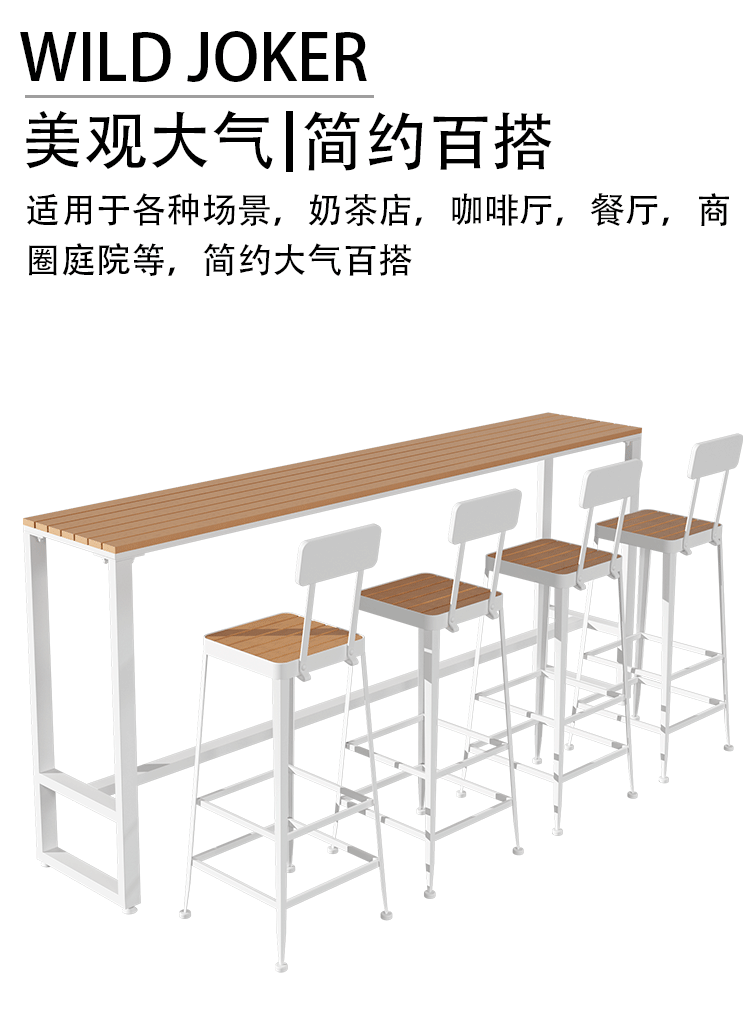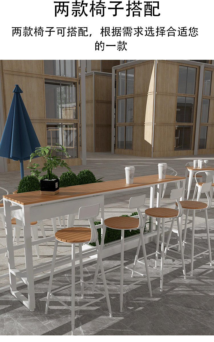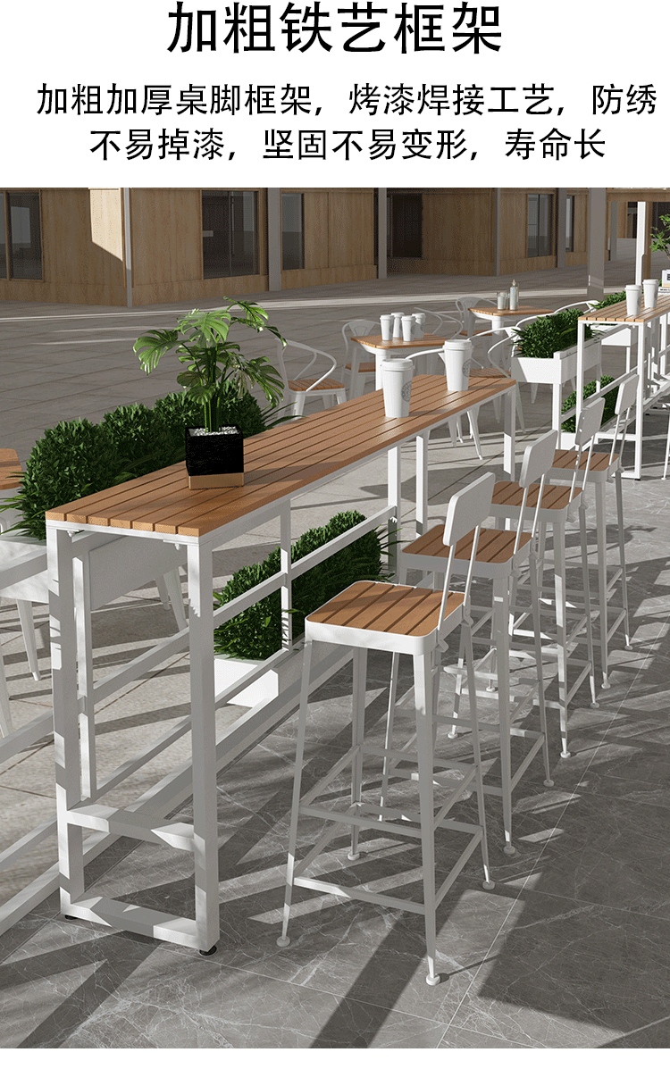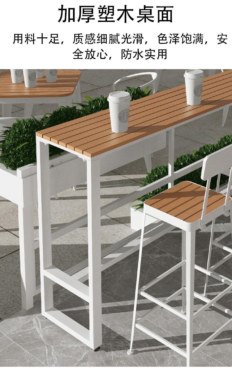 Cafe quán trà sữa ngoài trời nhựa gỗ quầy bar bàn ghế quầy bar ban công lộ thiên chân cao sắt trắng bàn dài