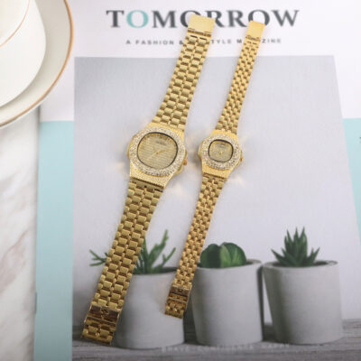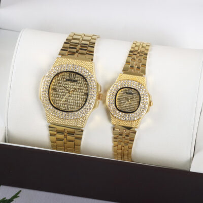 Cặp đôi thời trang bán chạy xuyên biên giới đồng hồ vàng nạm kim cương nam và nữ dây thép đồng hồ thạch anh đồng hồ một mảnh bán buôn 8843