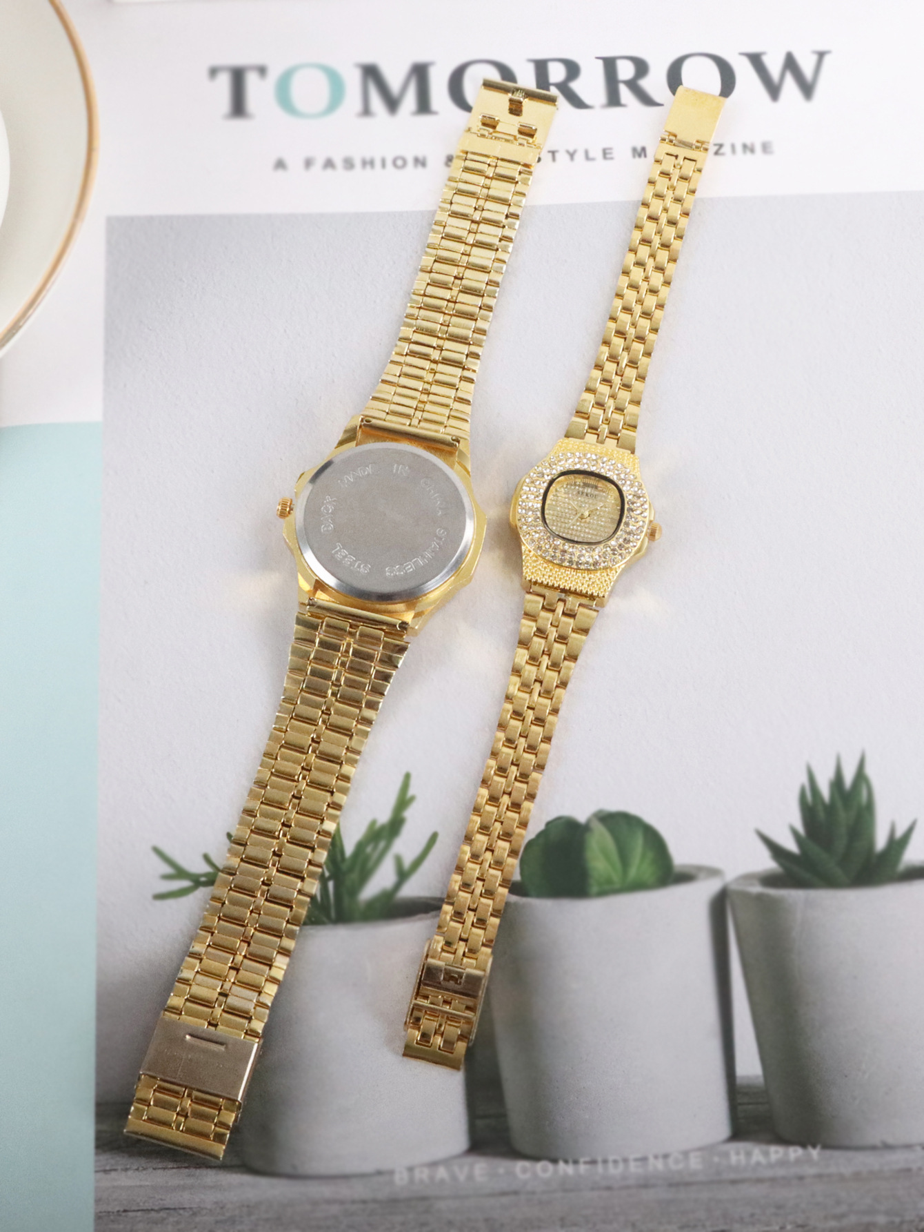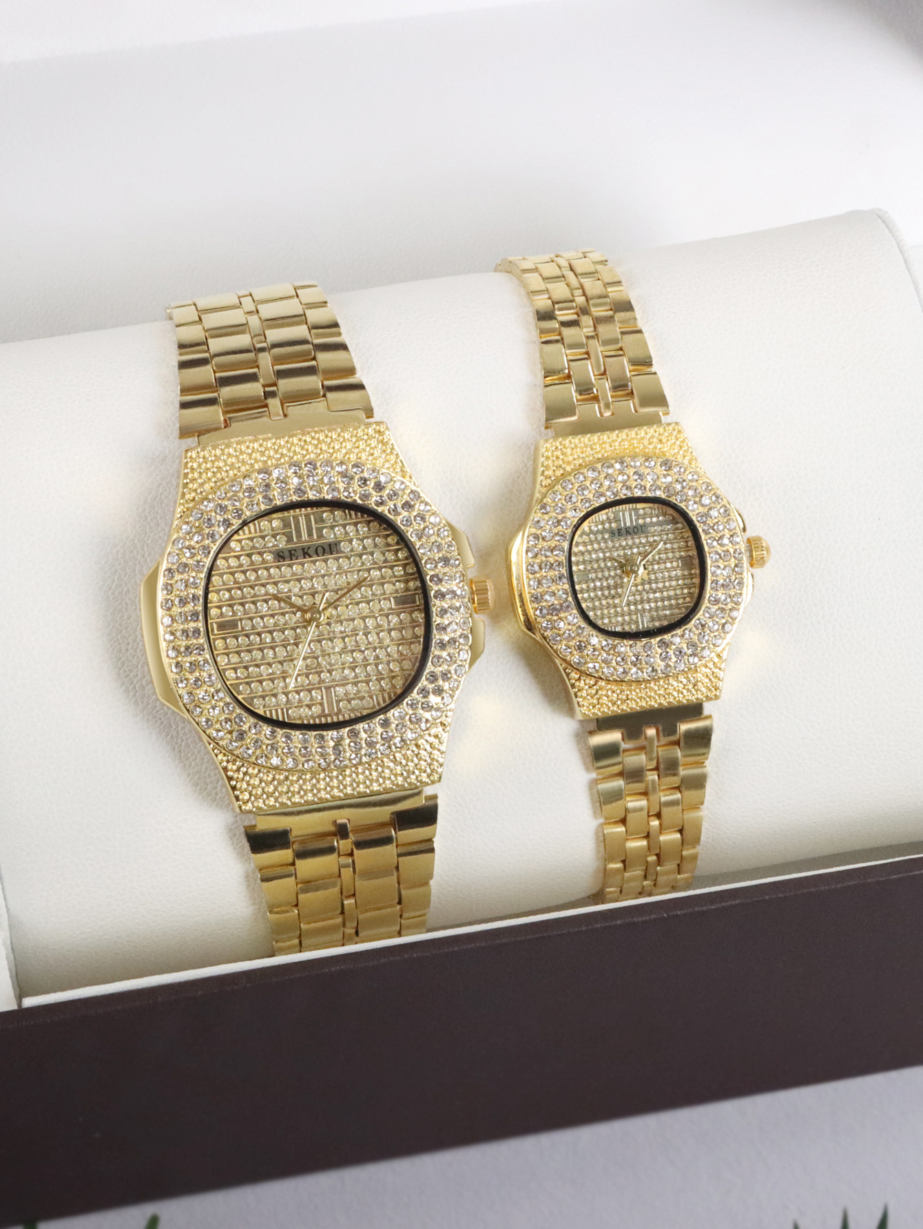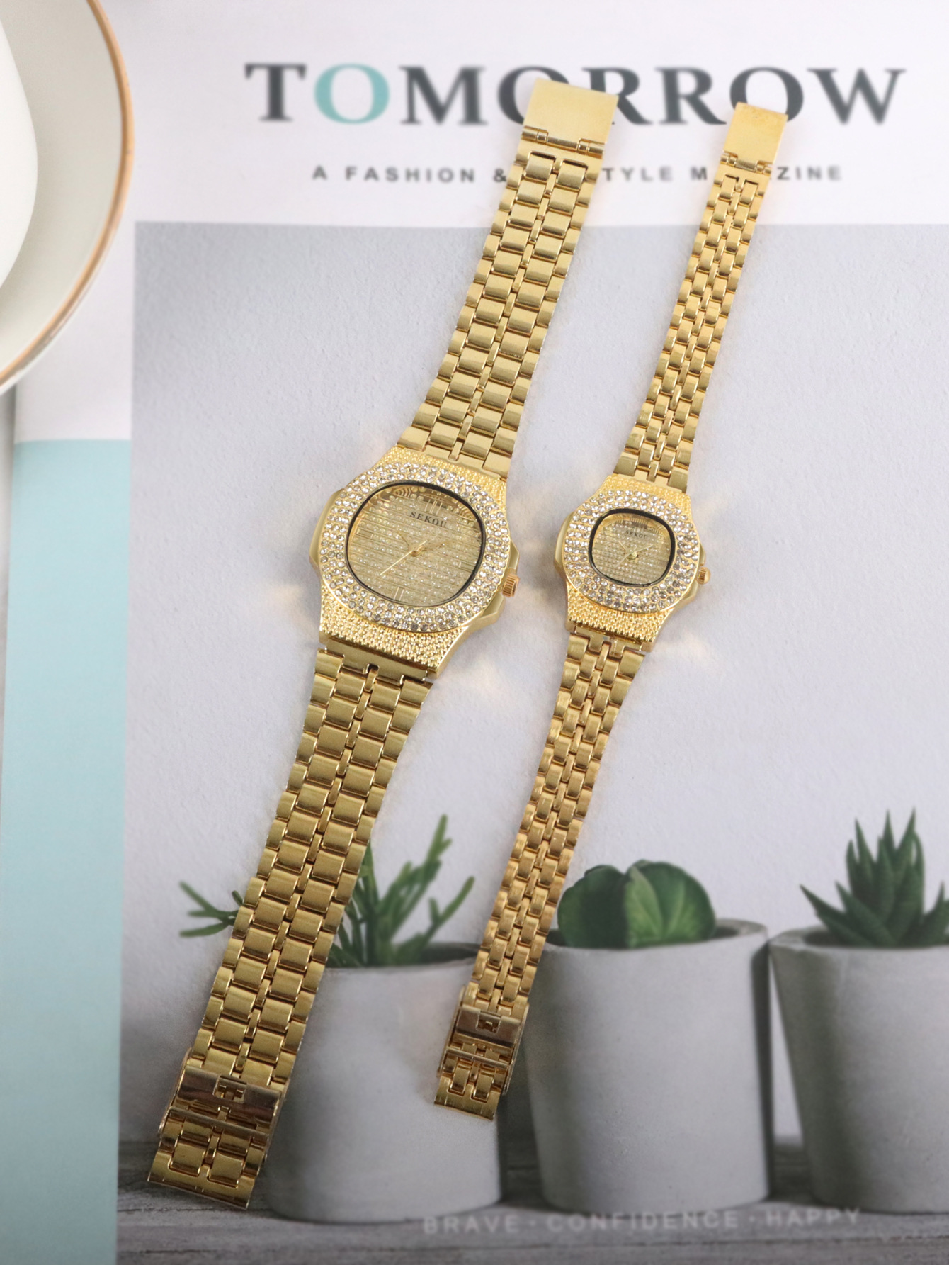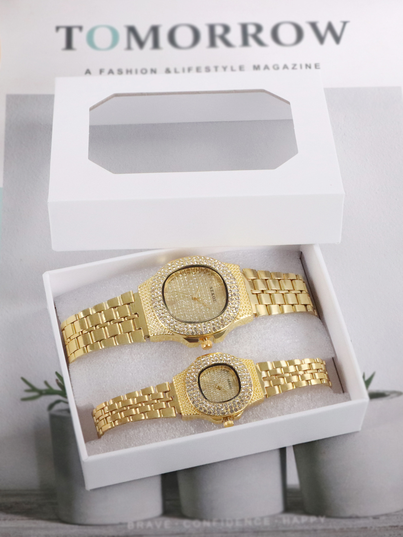 Cặp đôi thời trang bán chạy xuyên biên giới đồng hồ vàng nạm kim cương nam và nữ dây thép đồng hồ thạch anh đồng hồ một mảnh bán buôn 8843