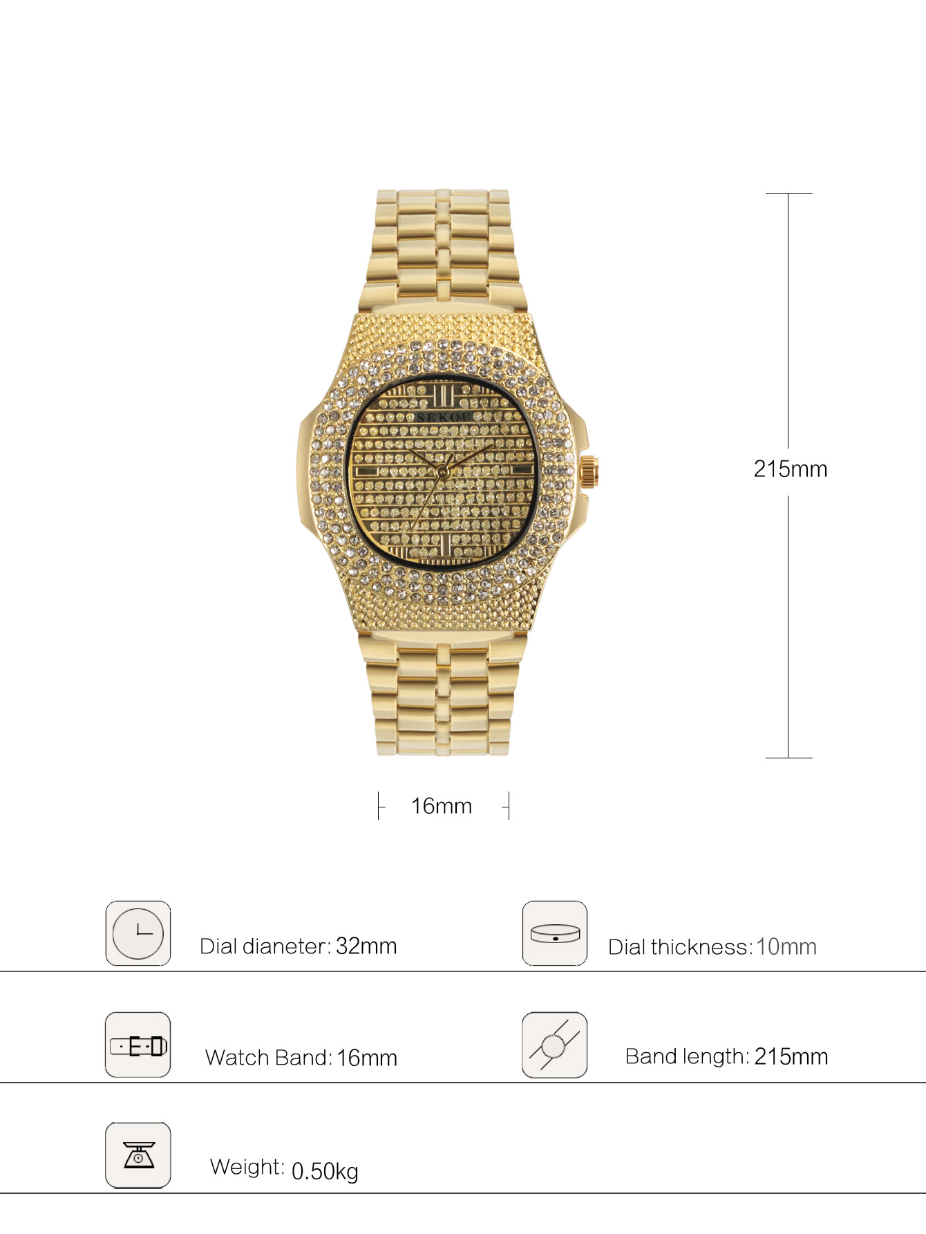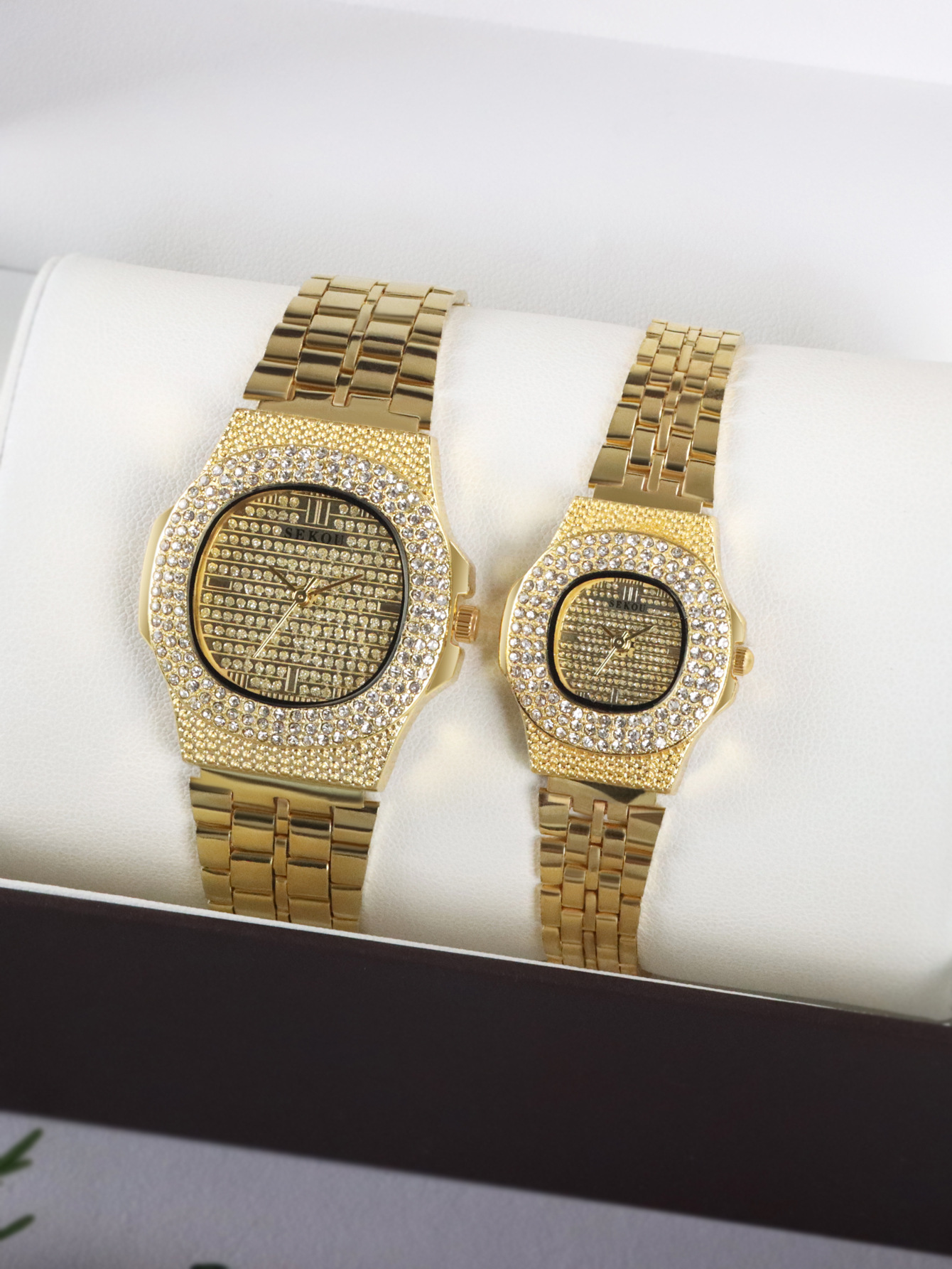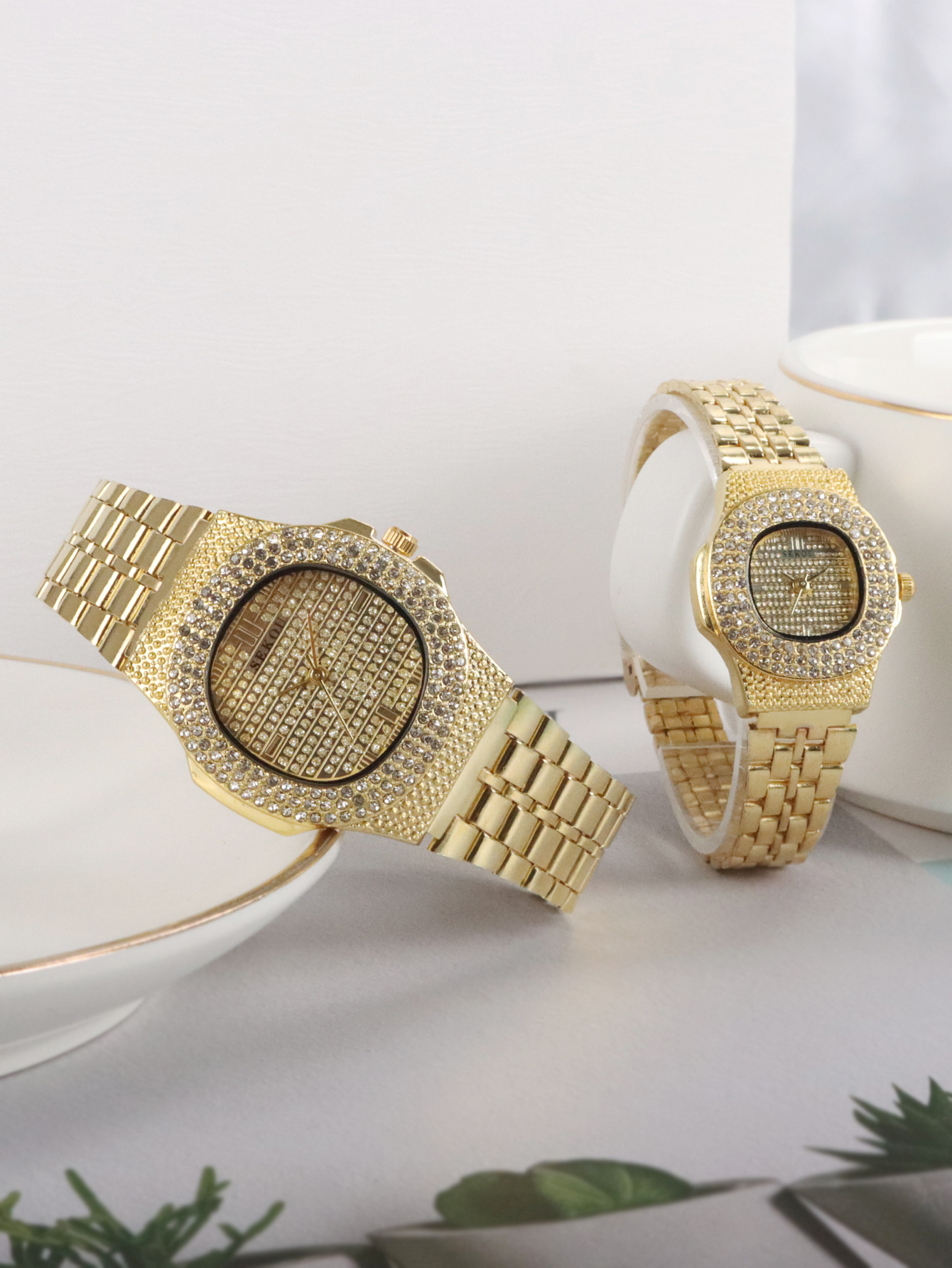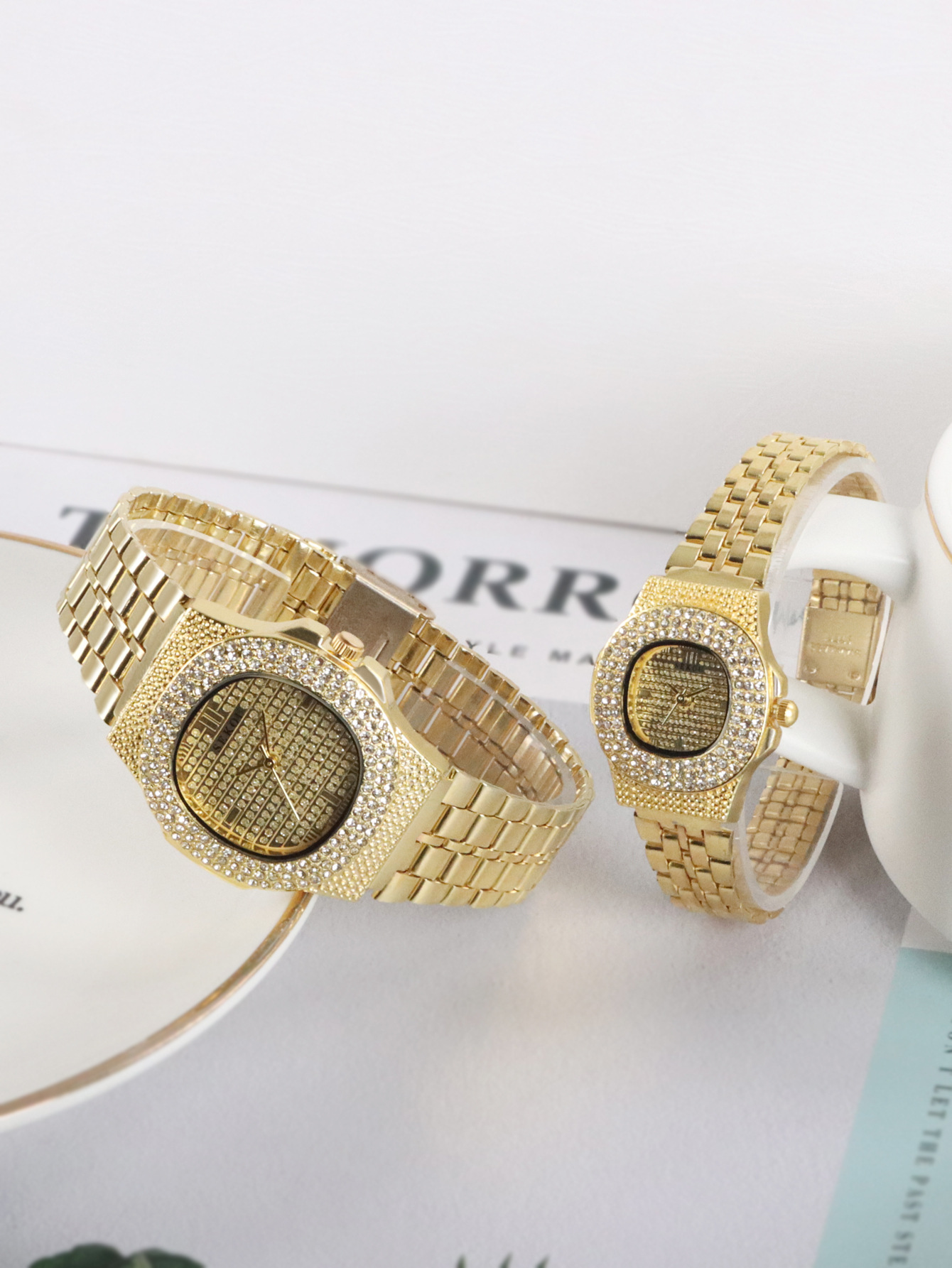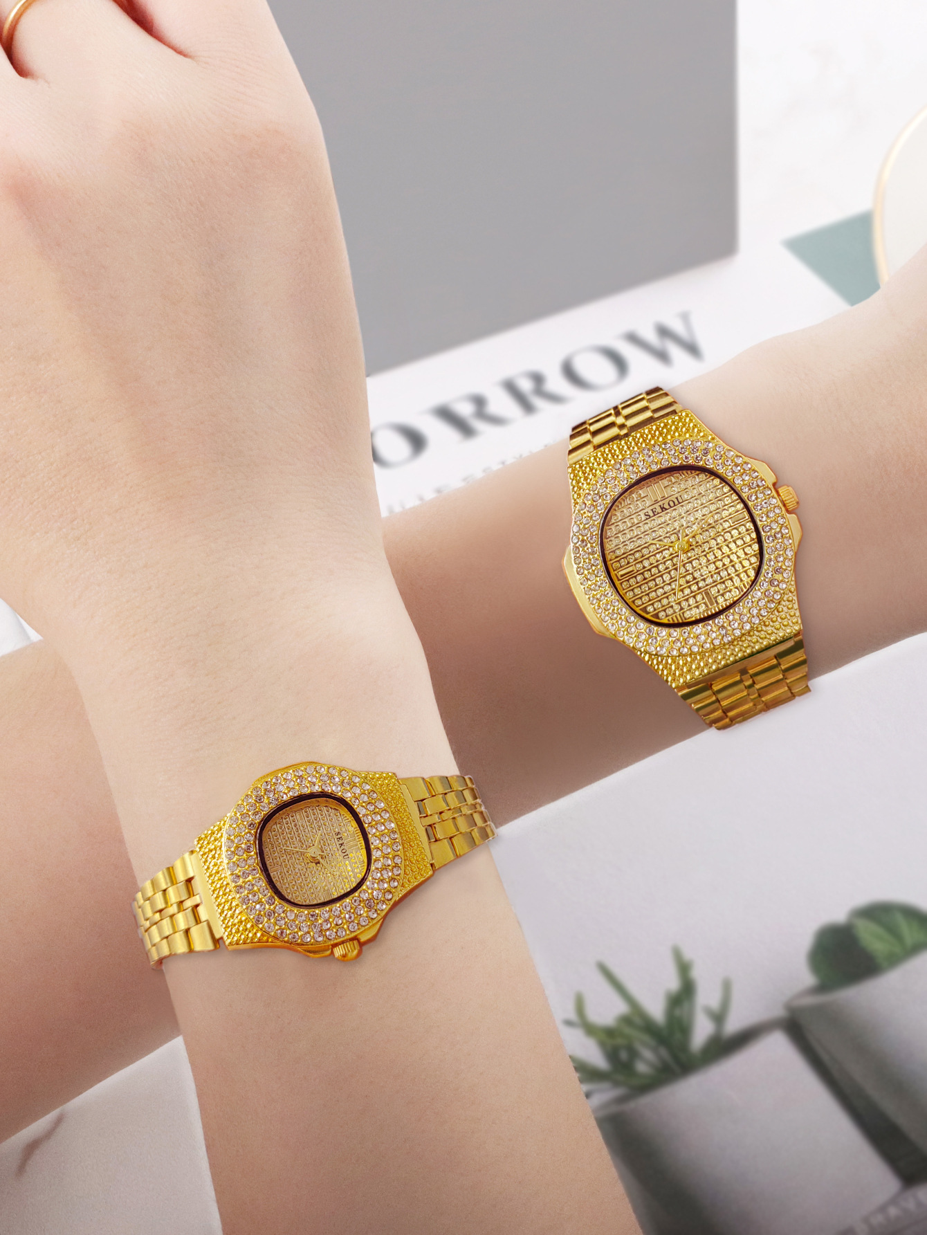 Cặp đôi thời trang bán chạy xuyên biên giới đồng hồ vàng nạm kim cương nam và nữ dây thép đồng hồ thạch anh đồng hồ một mảnh bán buôn 8843