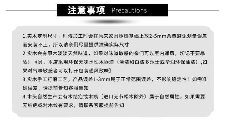 关于木料: 采用进口新西兰松木,整木开孔可能会有木结(结巴)油结,树脂不属于质量问题!手工打磨测量工具不同会有正负公差1-3mm,木纹为数木自然生长纹理,要求木纹一样者慎拍
