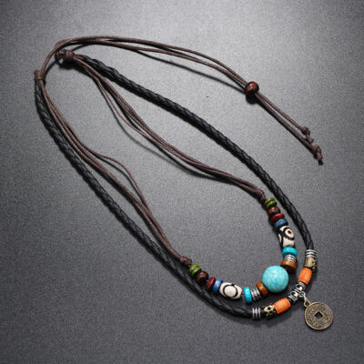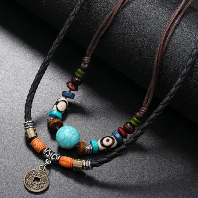 Châu Âu và Mỹ phong cách retro nhiều lớp ngọc lam đính cườm da dệt vòng cổ cá tính hợp kim đồng xu mặt dây chuyền vòng cổ nam