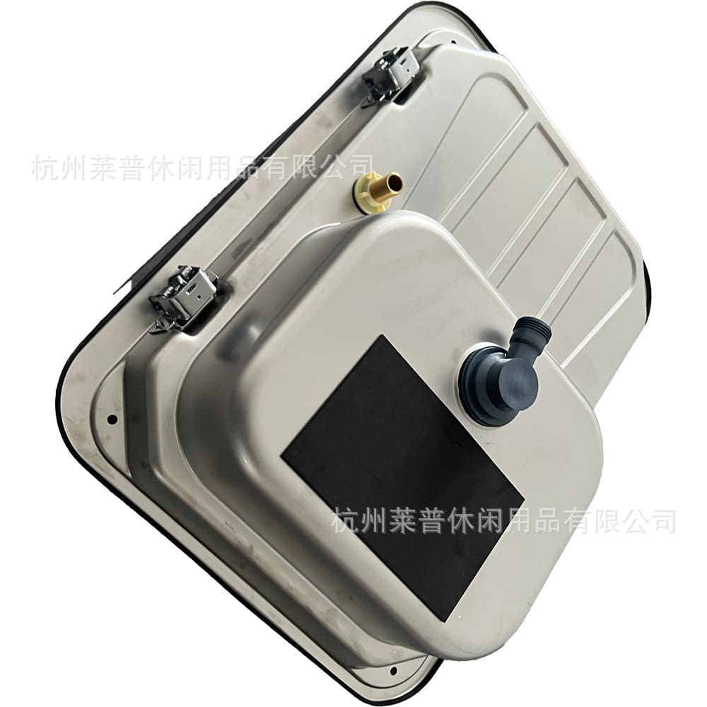 此款房车水槽长度为630mm,宽度为478mm,高度190mm。纯手工测量可能存在误差。标准套装配备不锈钢折叠水龙头和下水一套。