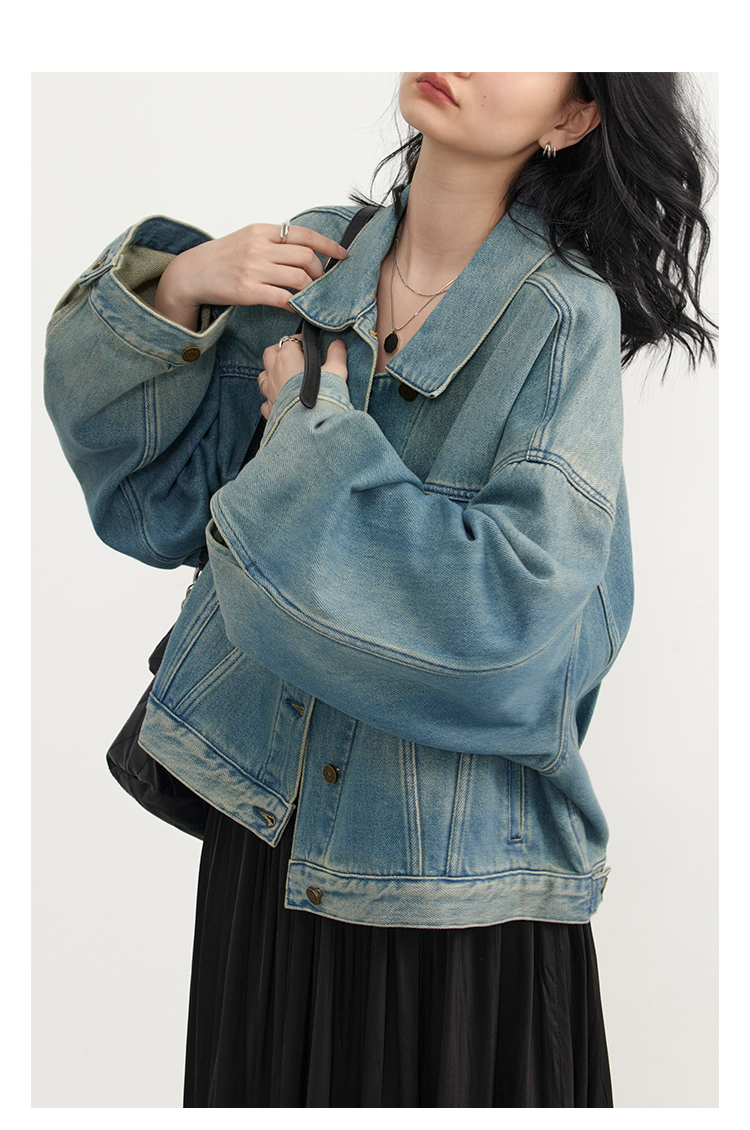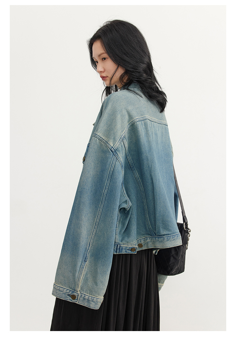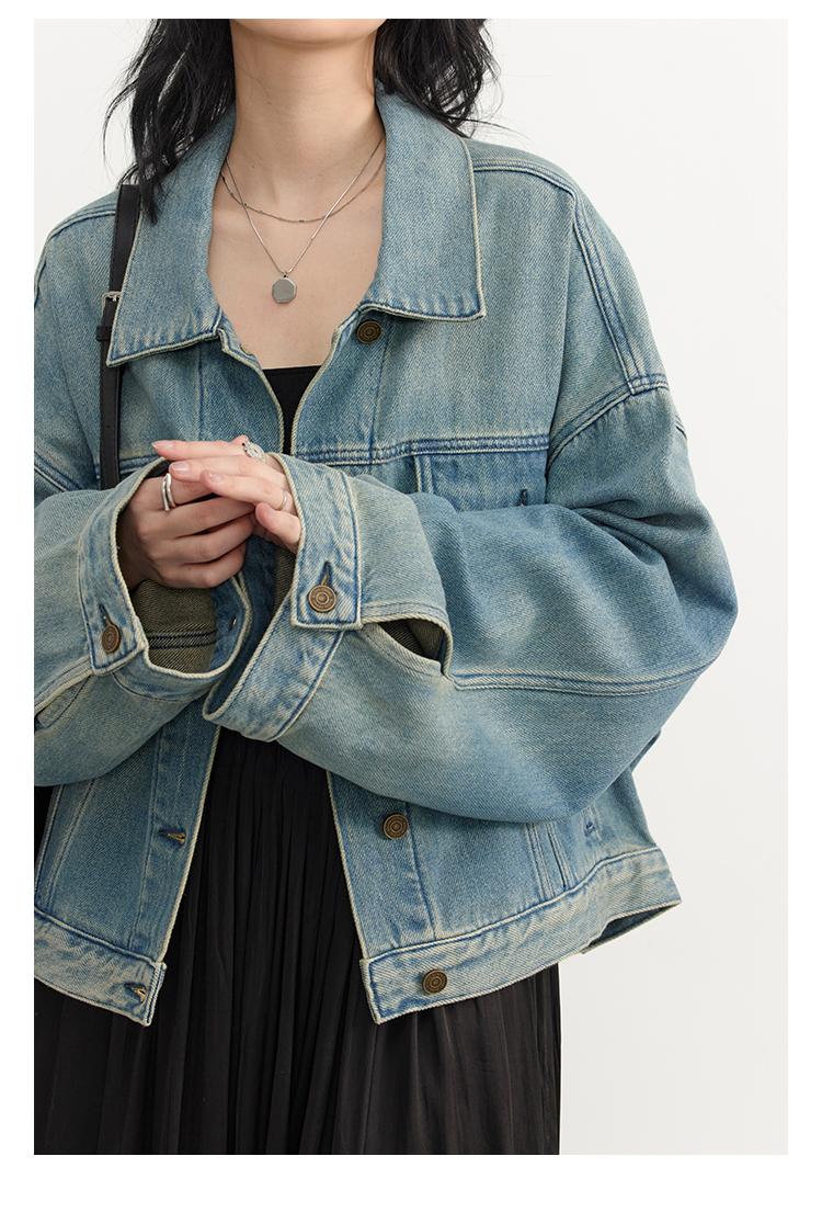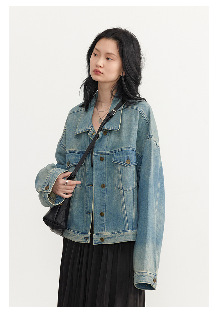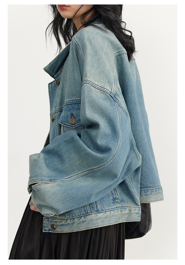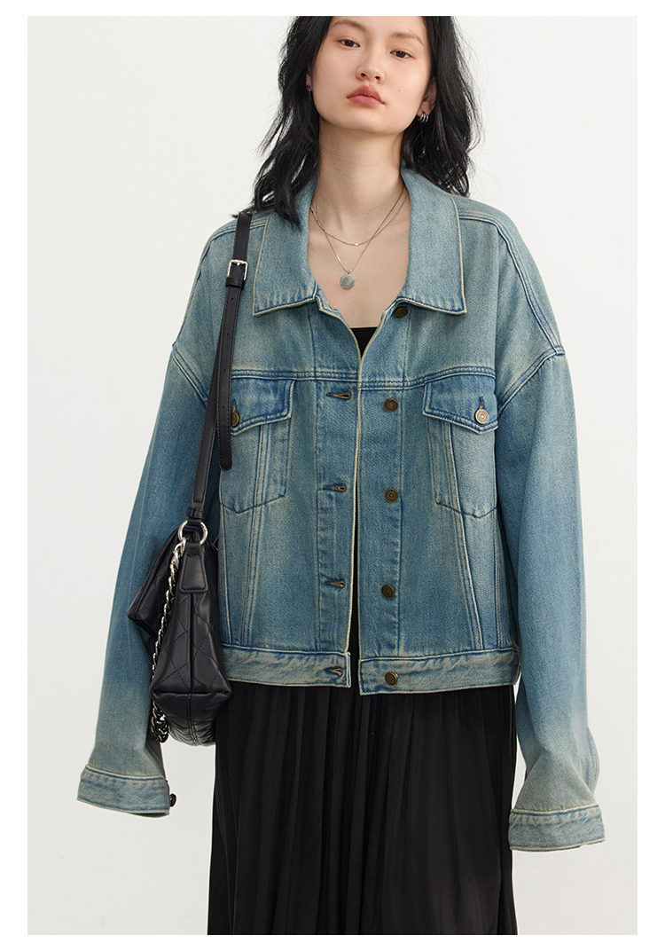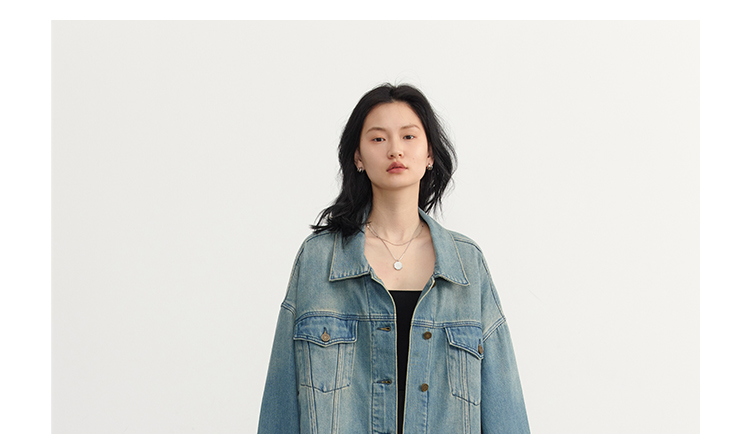 _x000D_ JING典翻领设计,利落随性叠穿有层次感 _x000D_ 前中单排门襟搭配金属纽扣,增加外套的复古属性 _x000D_ 前胸对称翻盖贴袋,放置物品增加实用性 _x000D_ 也可以把袖口卷起,更加慵懒随性的感觉 _x000D_ 水洗旧浅蓝的颜色DU特自然,反复调试才达成的效果 _x000D_