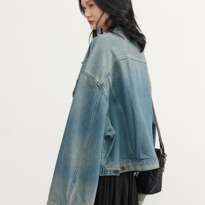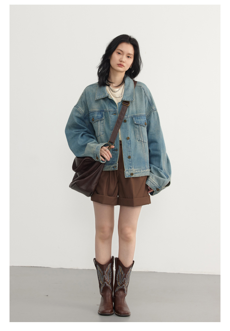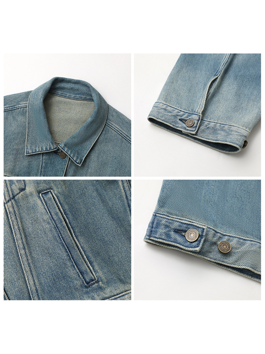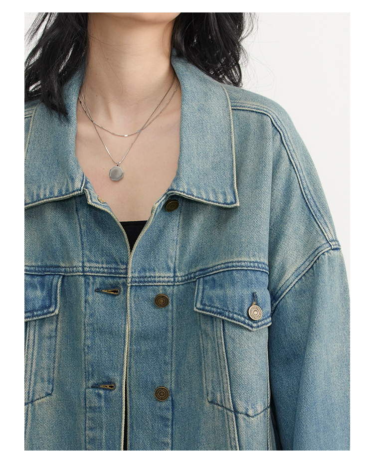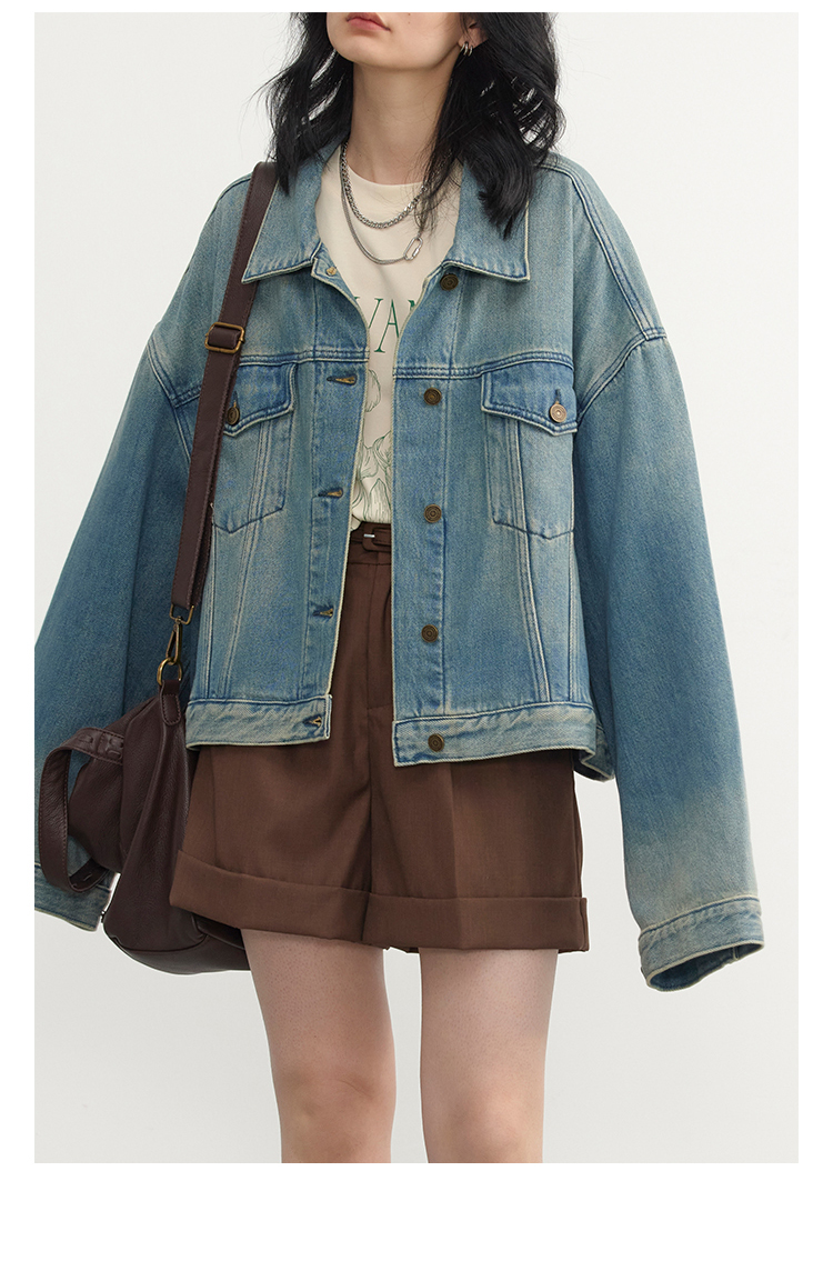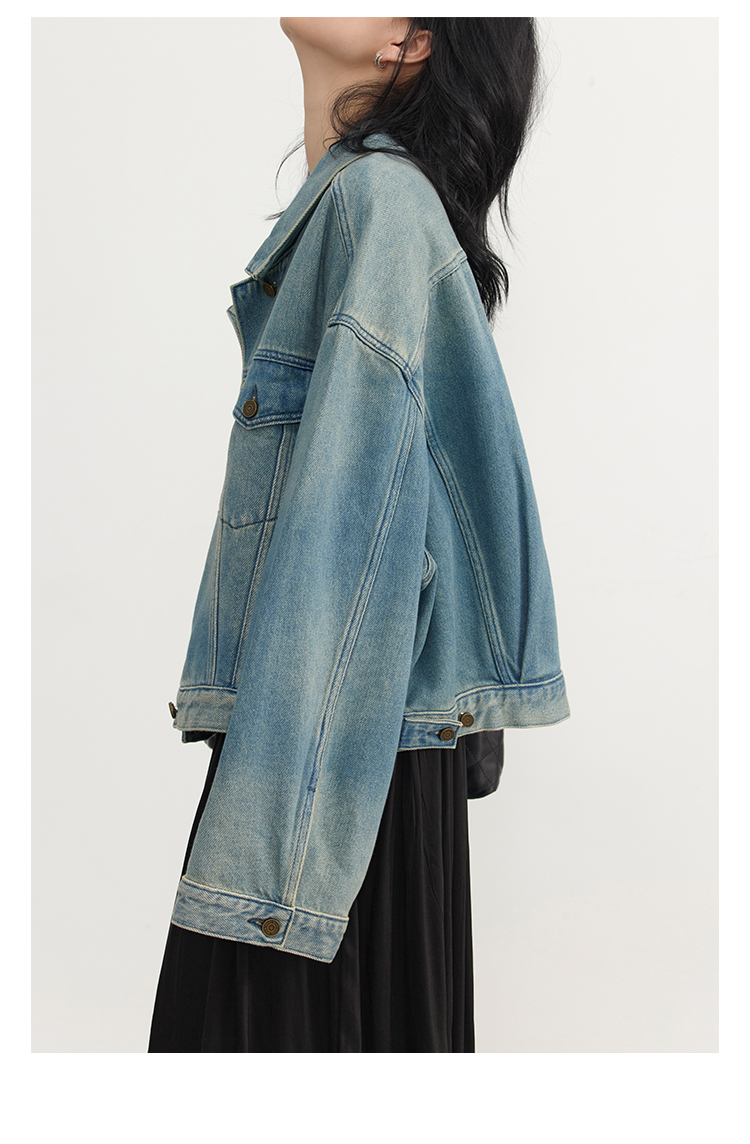 _x000D_ JING典翻领设计,利落随性叠穿有层次感 _x000D_ 前中单排门襟搭配金属纽扣,增加外套的复古属性 _x000D_ 前胸对称翻盖贴袋,放置物品增加实用性 _x000D_ 也可以把袖口卷起,更加慵懒随性的感觉 _x000D_ 水洗旧浅蓝的颜色DU特自然,反复调试才达成的效果 _x000D_