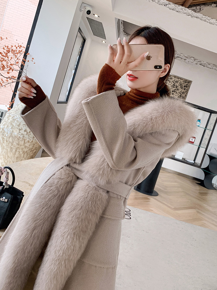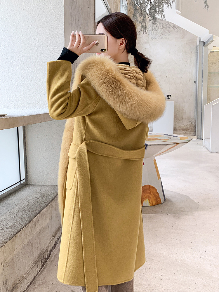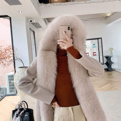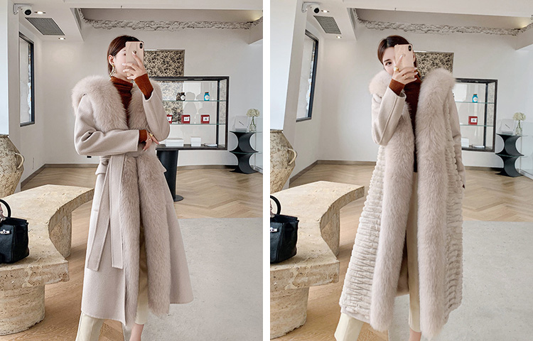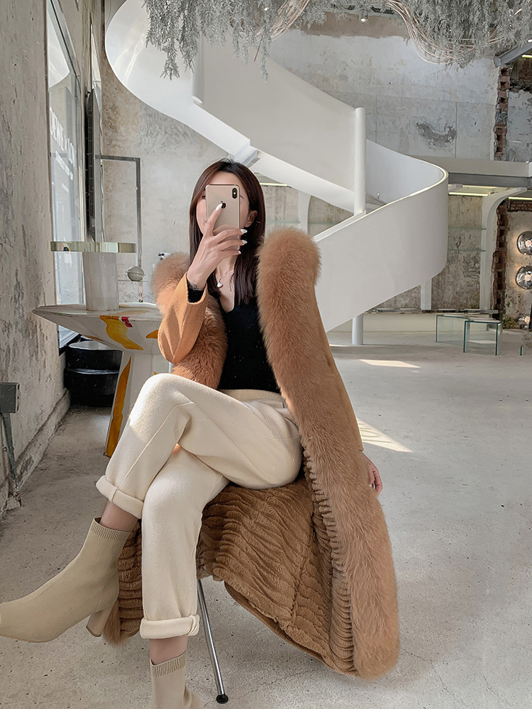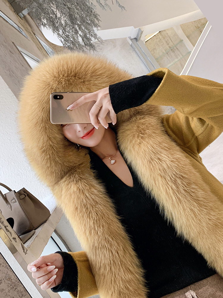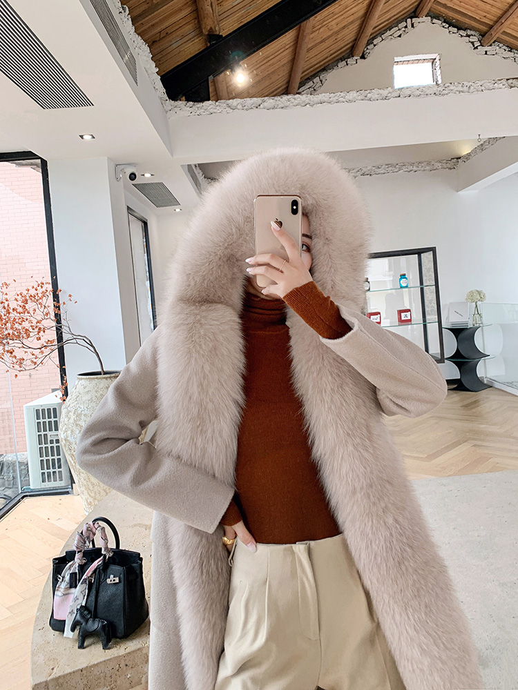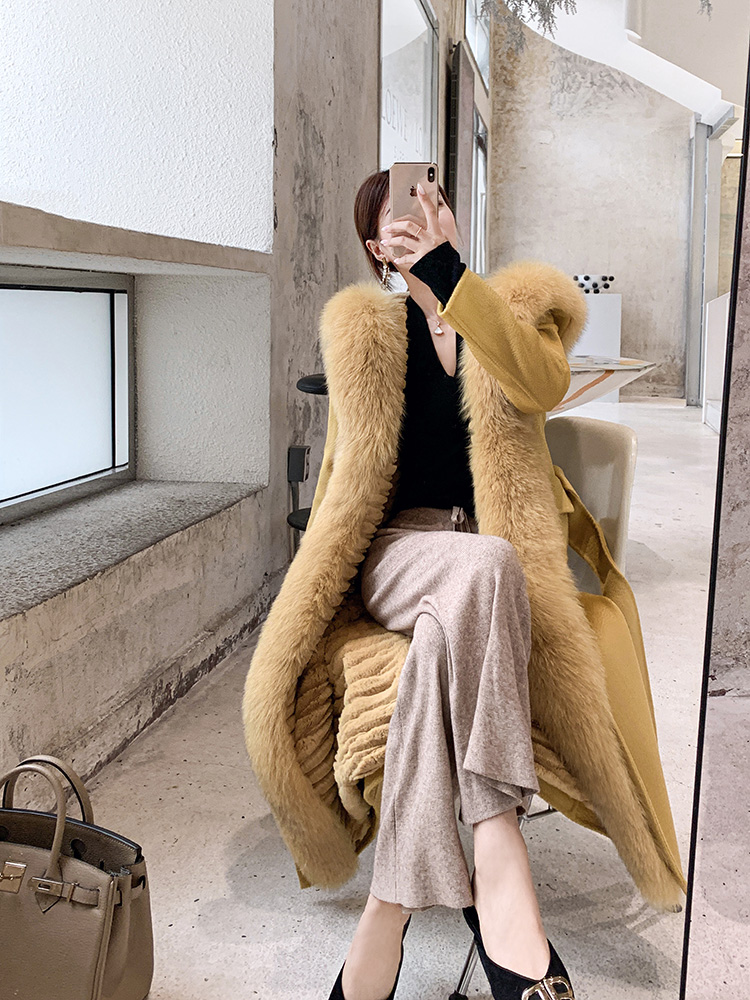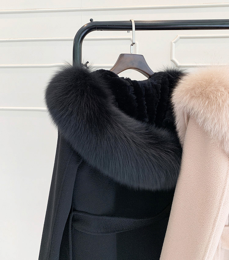 Có Mũ Trùm Đầu Cáo Cổ Lông Len 2 Mặt Áo Khoác Cashmere Rex Lông Thỏ Lót Bánh Vượt Qua Áo Khoác Lông Thú Nữ