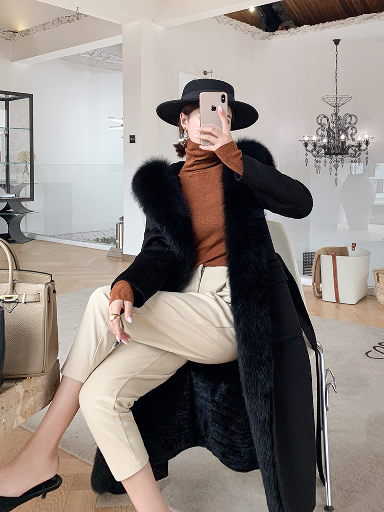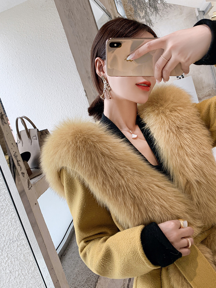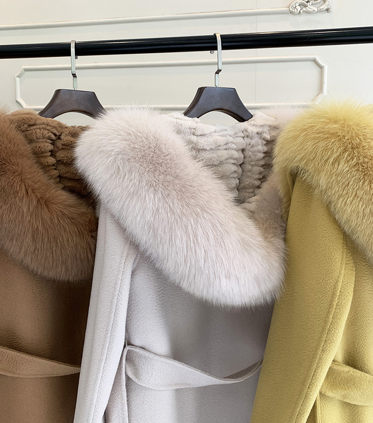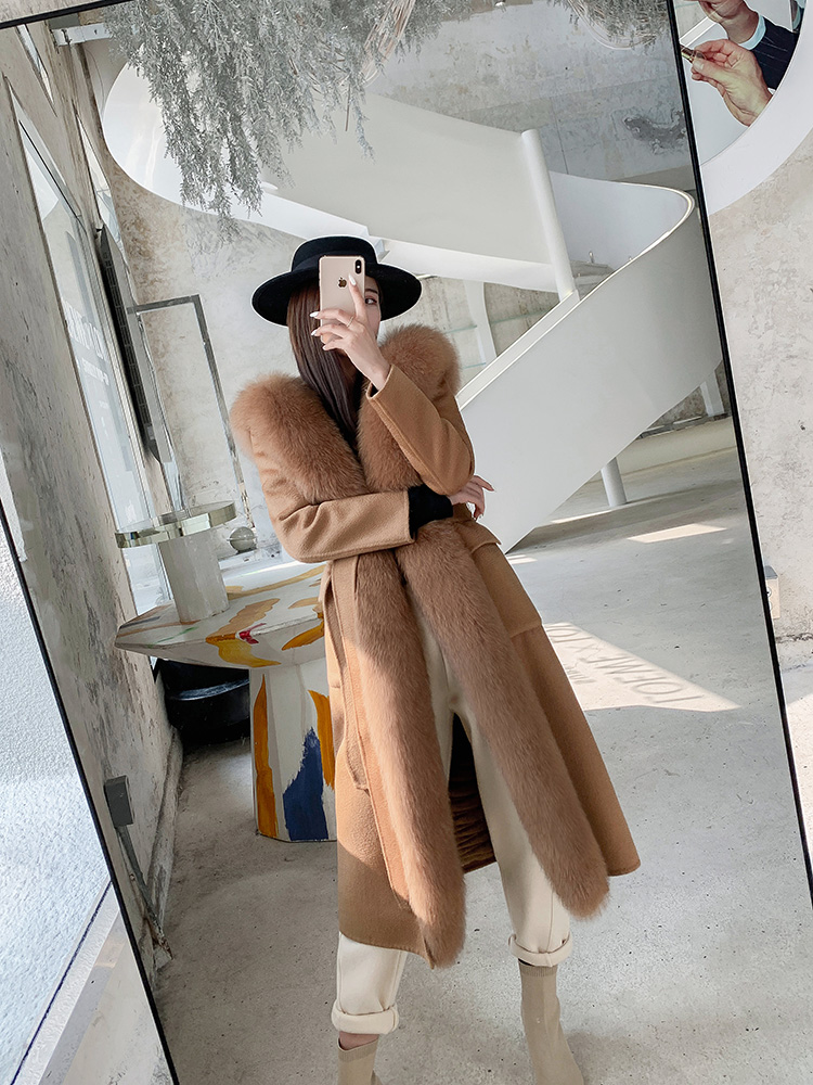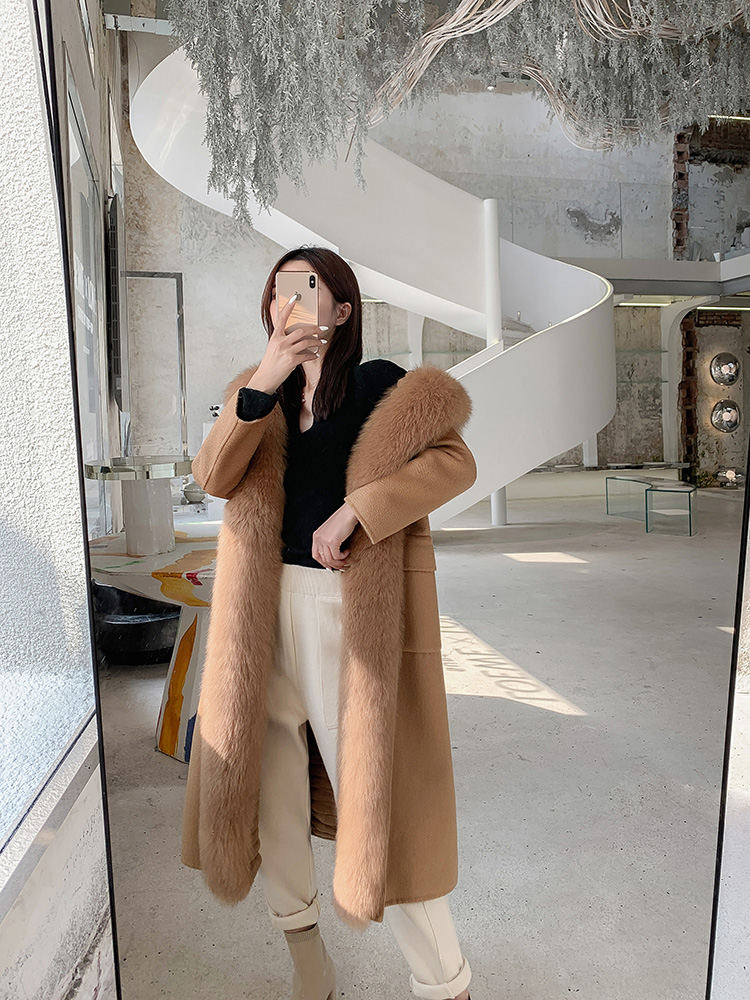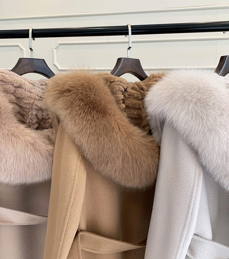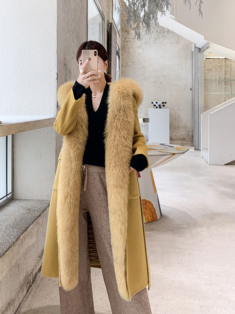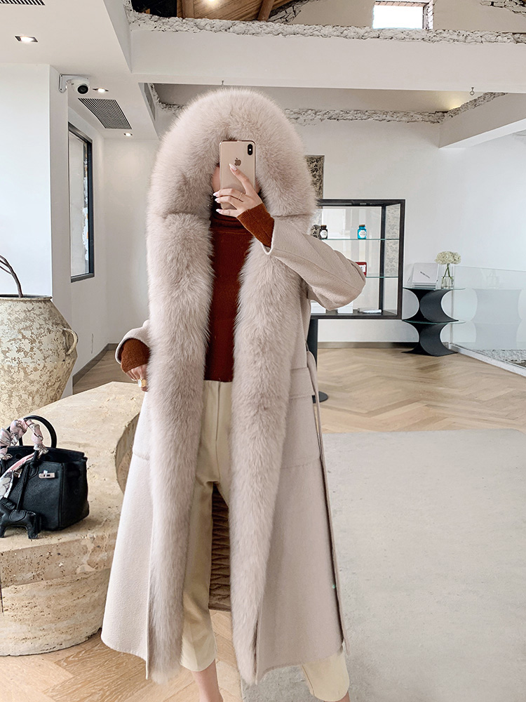 Có Mũ Trùm Đầu Cáo Cổ Lông Len 2 Mặt Áo Khoác Cashmere Rex Lông Thỏ Lót Bánh Vượt Qua Áo Khoác Lông Thú Nữ
