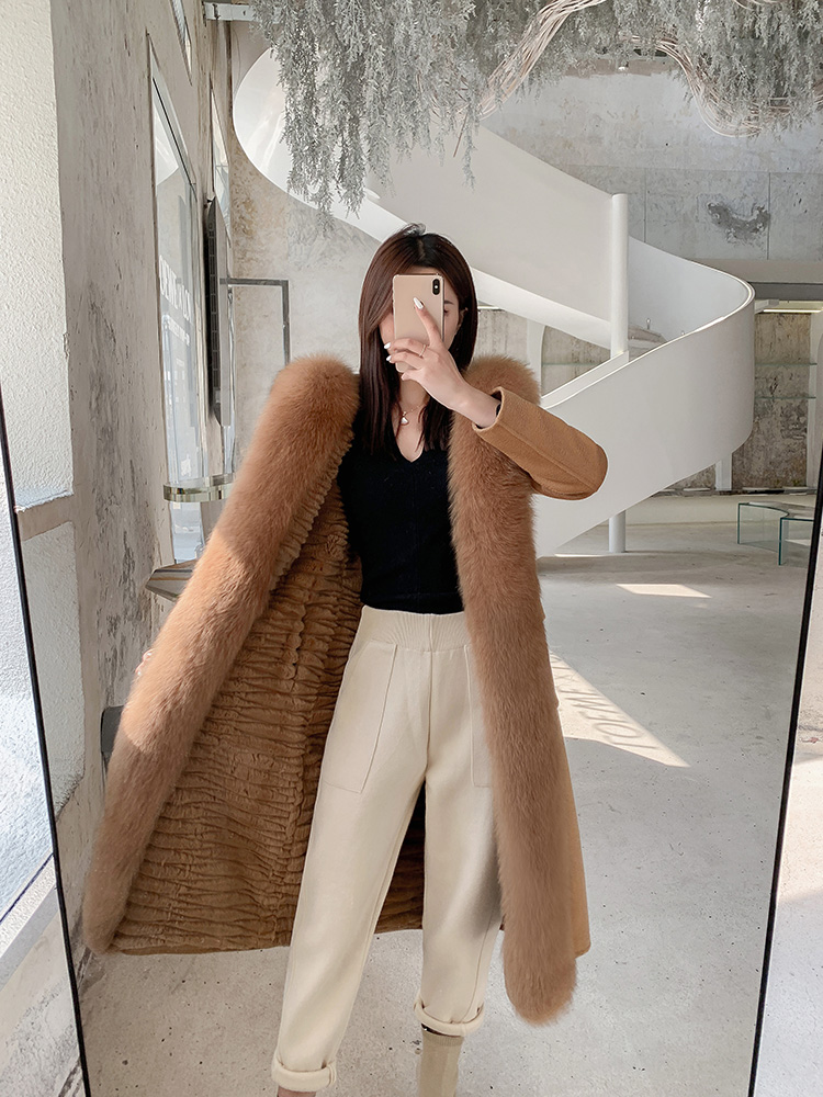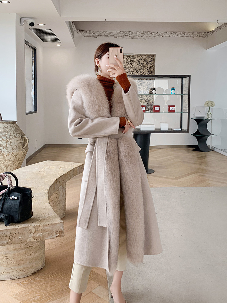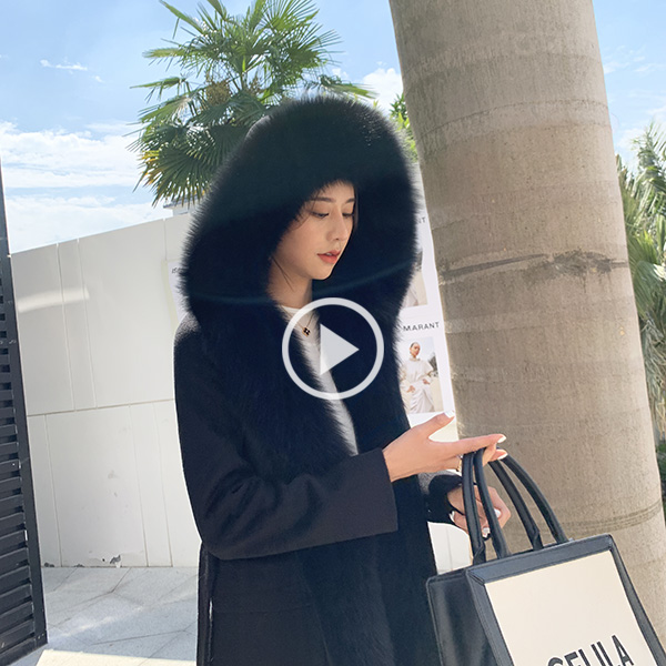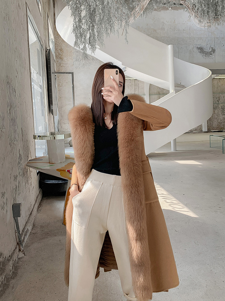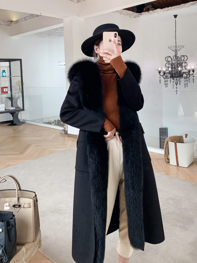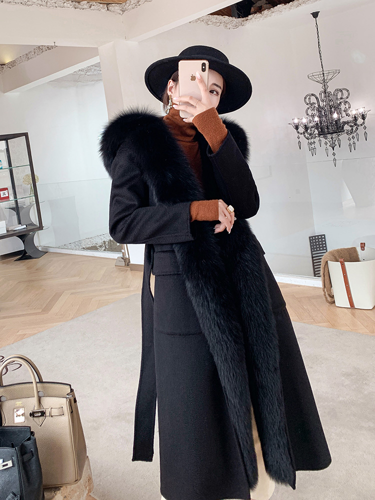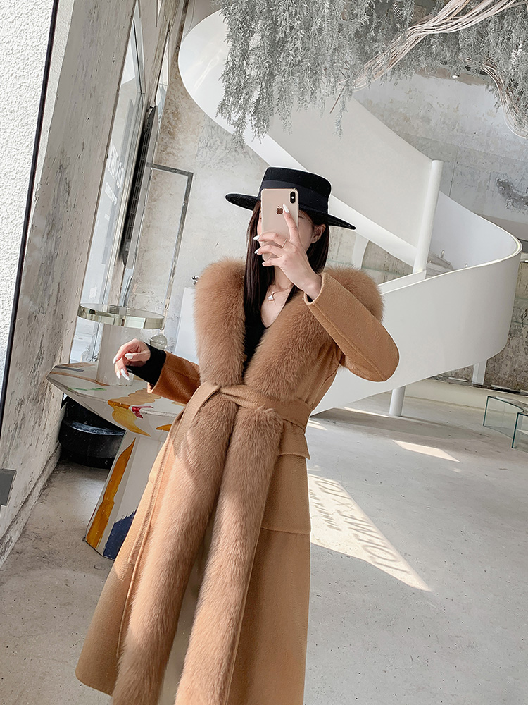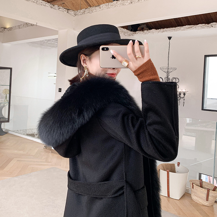 Có Mũ Trùm Đầu Cáo Cổ Lông Len 2 Mặt Áo Khoác Cashmere Rex Lông Thỏ Lót Bánh Vượt Qua Áo Khoác Lông Thú Nữ