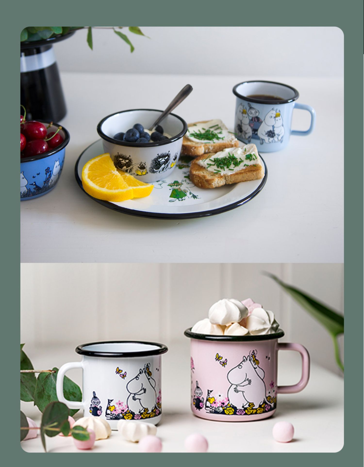 Cốc tráng men họa tiết dễ thương thu hút các em nhỏ.
