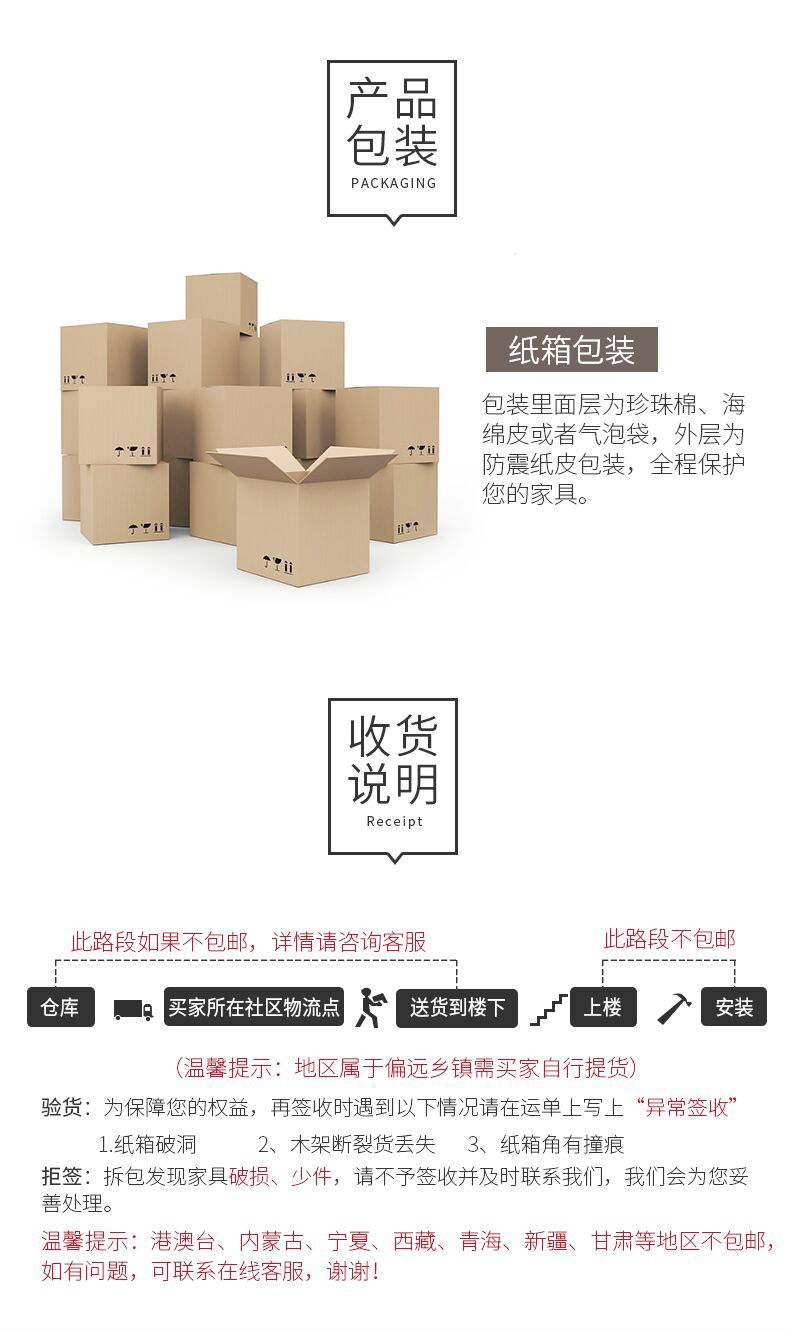 物流正常派送区域都会派送到楼下,注意限行路段、限卡车路段无法派送请自提,产品运费请拍下前咨询客服,包邮运费不包含上楼费。产品发货前我们都会仔细检查完好才发货,为确保亲的权益,签收产品前,请亲一定先开箱仔细检查!如果发现件数不对或破损请拒收,并联系我们,我们会找物流理赔,否则一旦签收(包括代签收)则表示对产品的正常完好性无争议,物流也就理赔不了,后续产生的费用须买家承担。