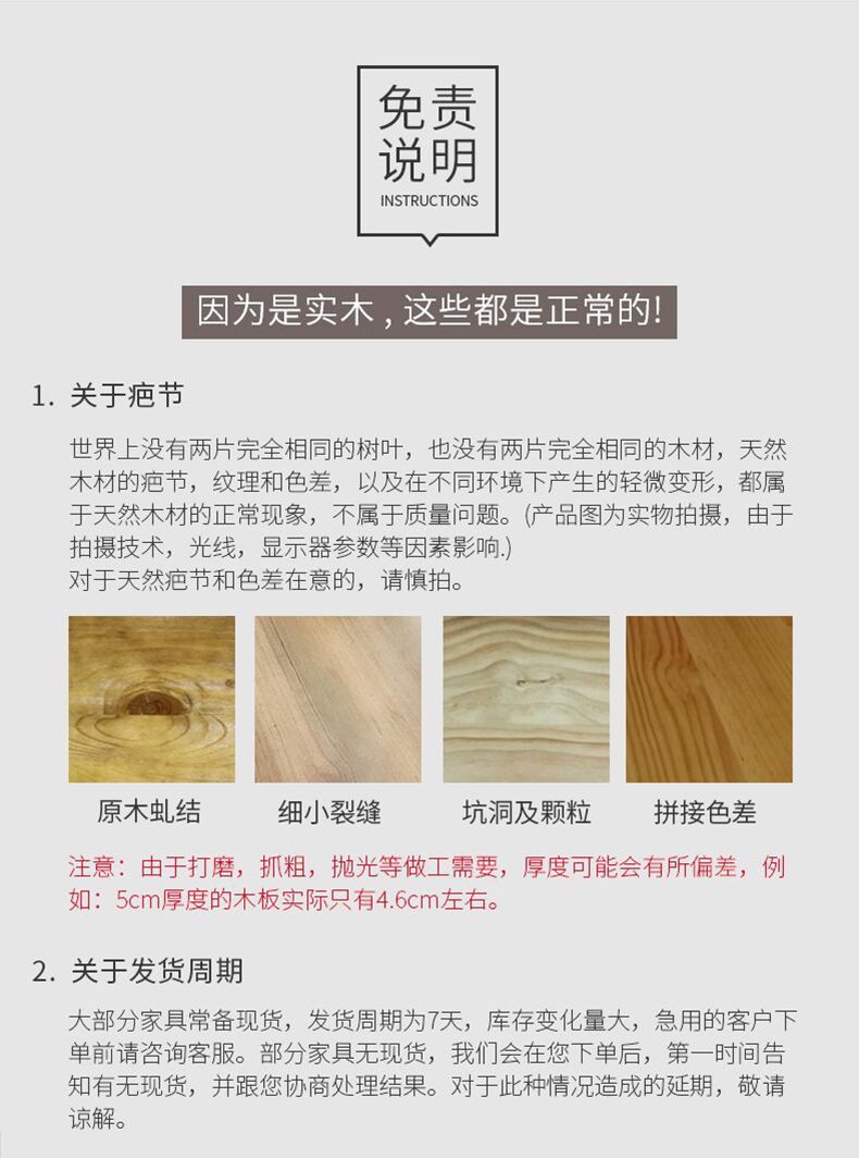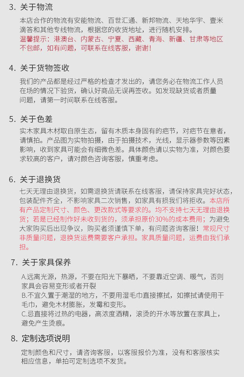 本店产品均为实物拍摄,由于拍摄技术、光线及各显示器参数的影响,收到的产品会与图片有差别,以实物为准!产品为手工制做,尺寸上也会有稍微差别,但我们会尽力做到接近、相似。对细节苛求完美的客户,下单前请咨询。因家具的特殊性所以定制类产品概不退换货、退款。