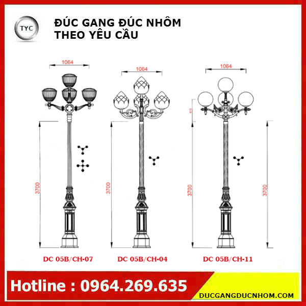 Cột Đèn DC05 là loại cột đèn phổ biến. Dùng để chiếu sáng và trang trí các công trình công cộng, sân vườn. Với nhiều năm kinh nghiệm trong lĩnh vực đúc và thiết kế cột đèn. Đúc gang đúc nhôm đã cung cấp một lượng lớn cột đèn đều đặn mỗi năm cho toàn quốc trong các công trình công cộng cũng như trong các hộ gia đình. Sản phẩm của chúng tôi vô cùng đa dạng về mẫu mã cũng như kích thước và chủng loại.