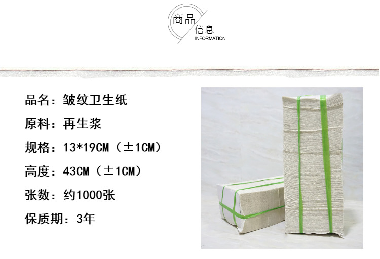 温馨提示:皱纹卫生纸因原材料及生产工艺的区别会有很多品种,此款为烘缸卫生纸,草浆材质,烘干脱水,纸重量偏轻,皱纹较粗,适合宠物用纸,生活用纸,机器擦拭,养殖场和果园用纸。