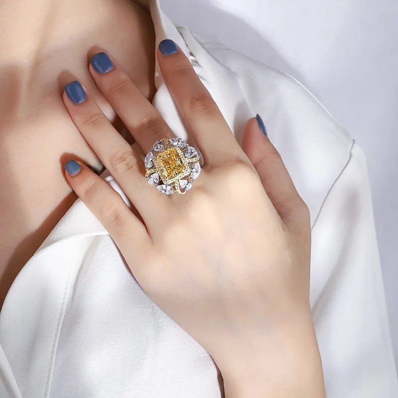 CSJ Citrine Rings Sterling 925 Silver Created Gemstone Topaz High Carbon Diamond Rediant Cut for Women Wedding Party Gift Box