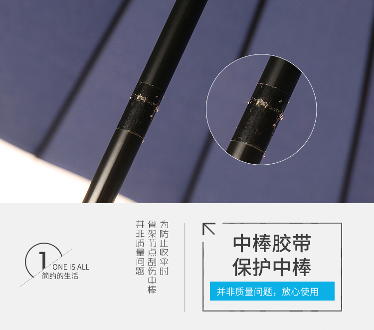 ps:关于伞的中帮上面有一圈胶带,不是质量问题。是为了防止收伞的时候,骨架结点刮伤中棒,在雨伞中棒上面缠上一圈胶带,不是质量问题,敬请安心购买!