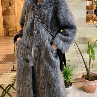 D-made dài tóc mohair mùa đông mới màu xám đen dài lớp GAO áo khoác len áo khoác len nữ