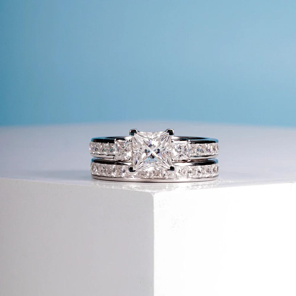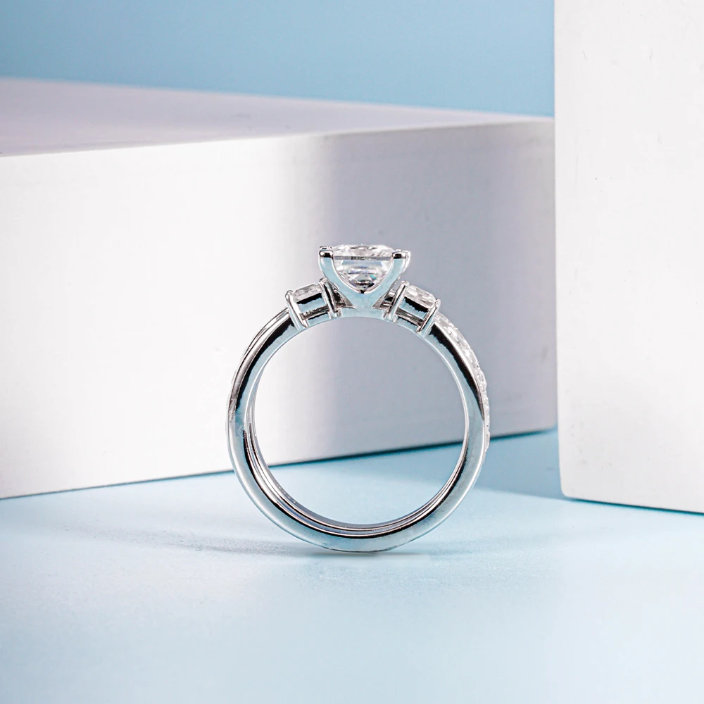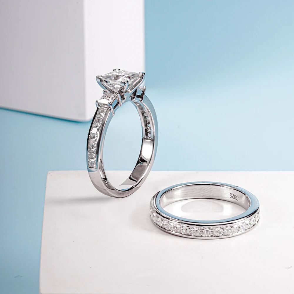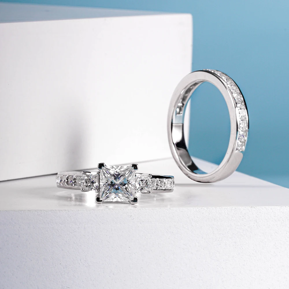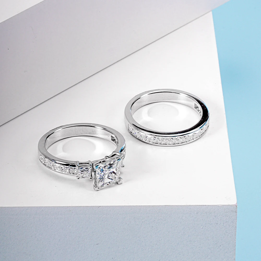 DAMLISA 1.2ct Main Stone D Color Princes Cut Moissanite Diamond Engagement Eternity Band 925 Sterling Silver Rings Set For Women