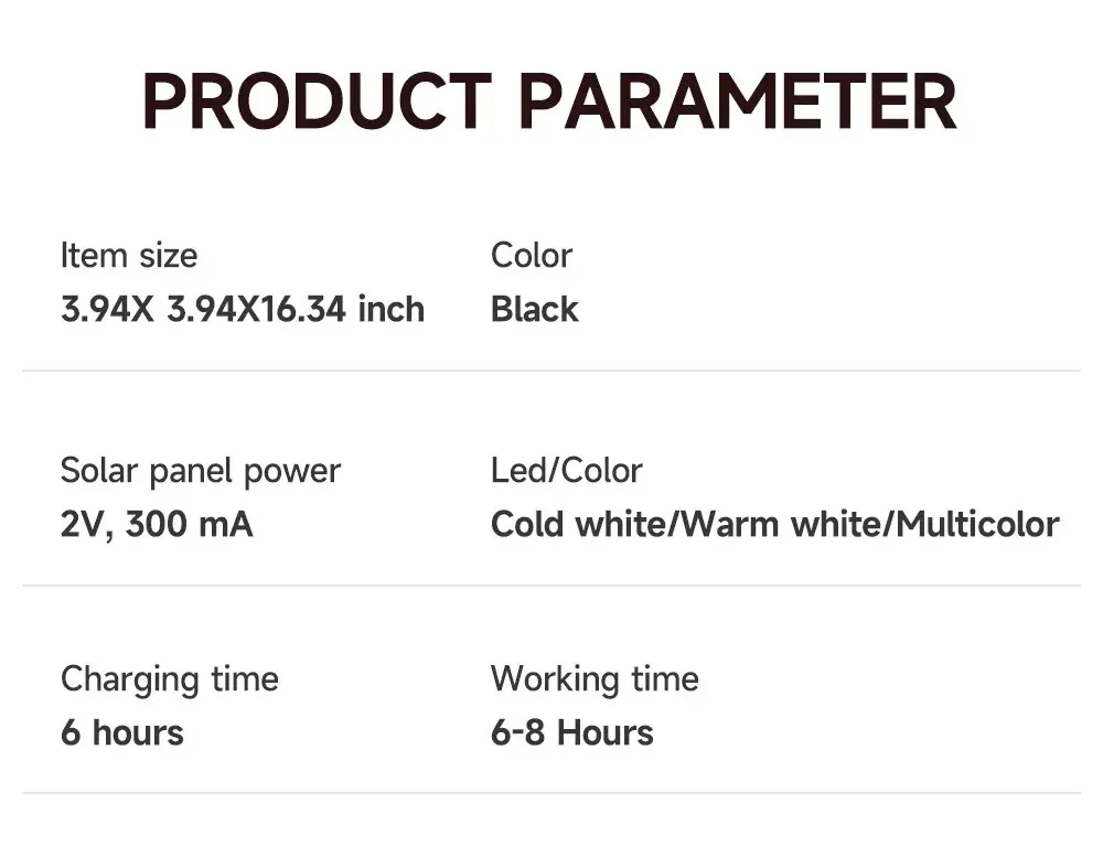 • Solar-powered :No need for electricity or batteries, these lamps are powered by the sun, making them eco-friendly and cost-effective.