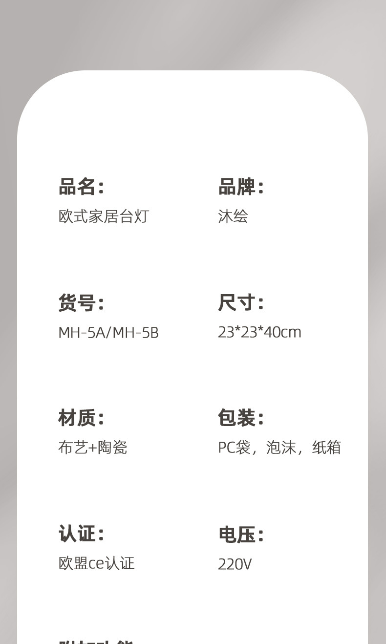 Đèn bàn gốm sứ, đèn bàn đầu giường ấm áp, phòng khách gia đình, trang trí phòng học, đèn ngủ lãng mạn cho con bú. Quý khách có nhu cầu mua Đèn để bàn nhập khẩu vui lòng liên hệ với chúng tôi để được tư vấn hỗ trợ. Dịch vụ mua hàng Trung Quốc sẽ hỗ trợ quý khách mua hàng từ nhà cung cấp và giao tới tận tay quý khách hàng..Mã số: 23115 Thương hiệu: Muhui Model: MH-5A/MH-5B Phương pháp xử lý: LOGO OEM Cho dù có bằng sáng chế hay không: Không Thông số kỹ thuật: Kích thước bao gồm chao đèn/công tắc nút nhấn Chứng nhận: Chứng nhận EU CE Người nộp thuế chung: Không Kích thước: MH-5A vỏ trắng 23*23*40cm/MH-5A chấm đen nhạt 23*23*40cm/MH-5A chấm đen 23*23*40cm/MH-5A gai dầu xám 23*23*40cm/MH-5A gai cà phê 23*23*40cm/MH-5A TC đen 23*23*40cm/MH-5B vỏ trắng 23*23*40cm/MH-5B chấm đen nhạt 23*23*40cm/MH-5B chấm đen 23*23*40cm /MH-5B vải lanh xám 23*23*40cm/Vải lanh cà phê MH-5B 23*23*40cm/MH-5B TC đen 23*23*40cm/MH-5B TC đen 23*23*40cm Chức năng bổ sung: trang trí/đêm Đèn/Đèn học/Đèn xung quanh/Đèn xung quanh Điện áp: 220V Có độc quyền xuất khẩu xuyên biên giới không?Nguồn cung cấp: Không Chất liệu đui đèn: Gốm Kiểu dáng: Nhẹ nhàng sang trọng