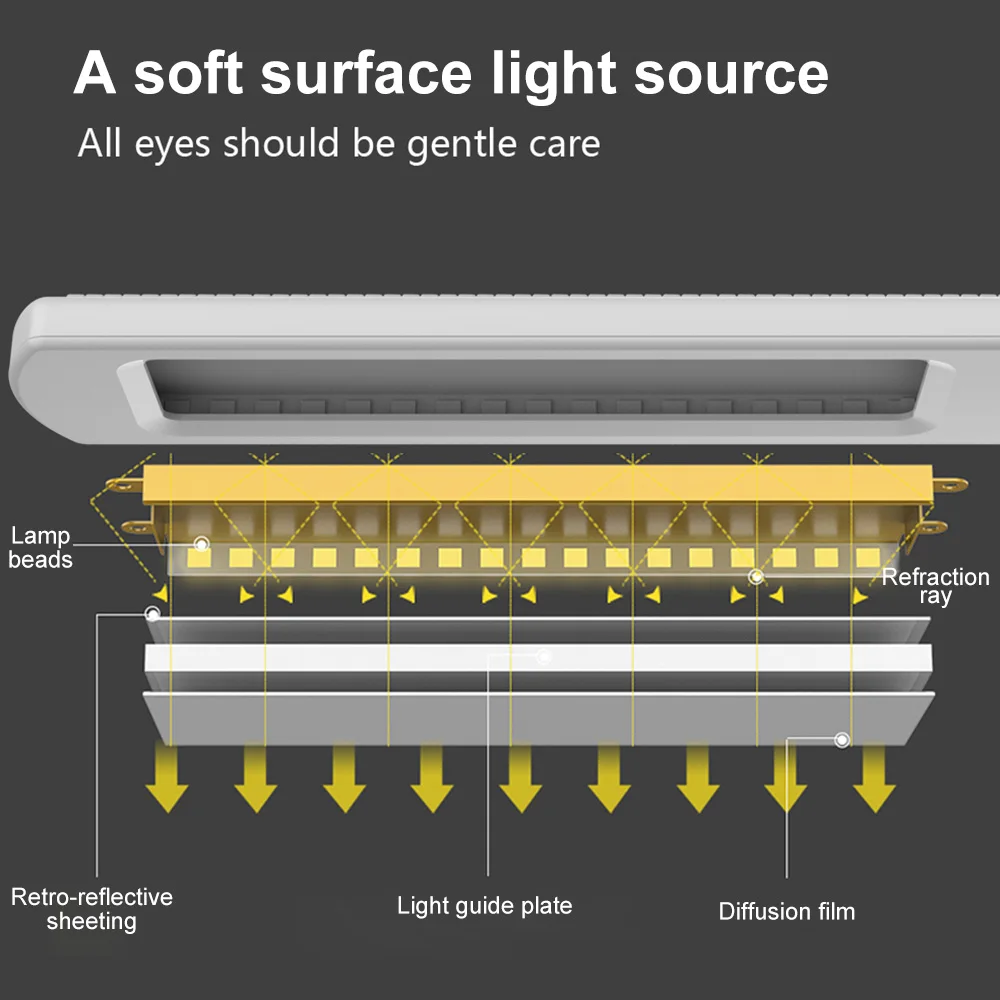 4: [Folding eye protection LED table lamp]: Our eye protection table lamp is suitable for home office lighting, without stroboscopic, glare and ghosting, reducing blue light damage, and eye protection LED table lamp reduces eye fatigue, helping you work or study for a long time and other eye protection LED table lamps. The foldable design allows you to save space when not in use, and the angle adjustment can meet the lighting needs of different angles.