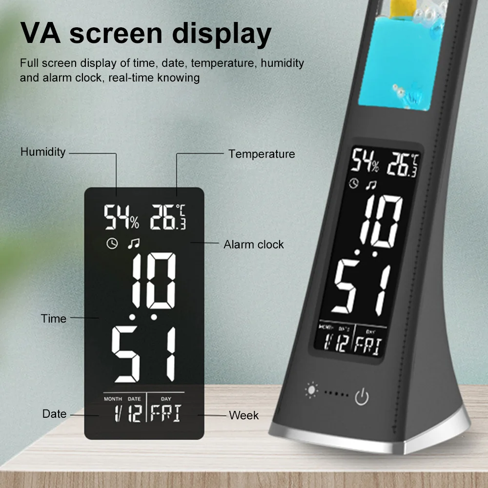 2: [Multi function design] Touch button, with colorful atmosphere lamp, USB charging port for charging and plugging, stepless dimming, folding, calendar display, clock, alarm clock, temperature and humidity display and LCD screen, not just table lamp, all these functions are easy to set to meet your different needs.
