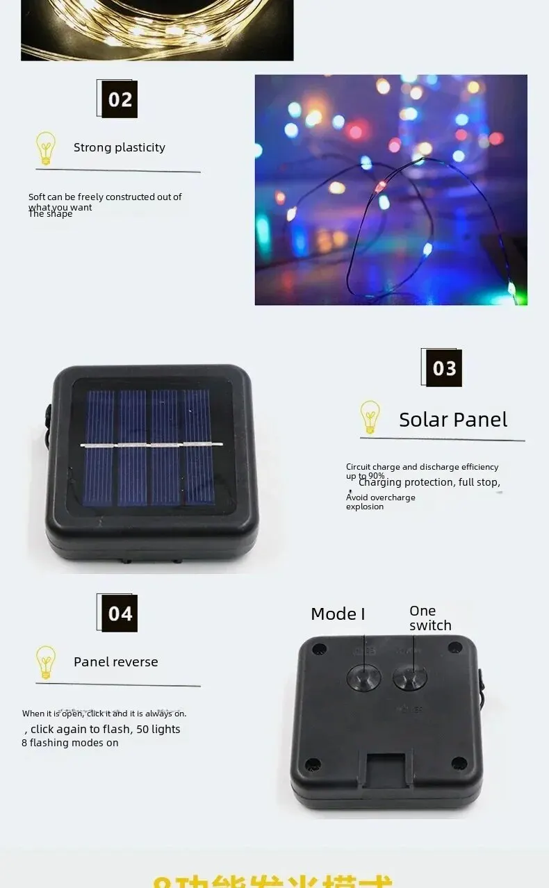 • Solar Powered :No need for electricity or batteries, this light string is powered by the sun, making it eco-friendly and cost-effective.