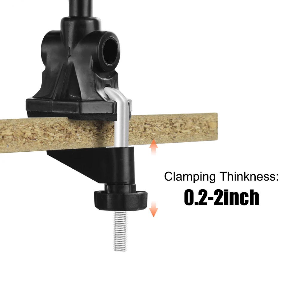 1.The durable clip can be fixed to any flat surface that is less than 2”/ 5 cm (max) thick. It saves space, conveniently attaches to a desk, workbench.