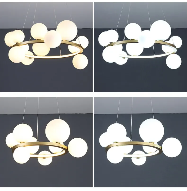 8 heads/12 heads – Gold lamp body – Milky white lampshade – Warm light/white light effect live display.