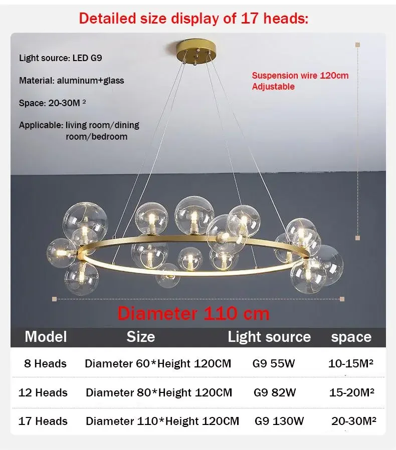 Model: 17 heads, size: diameter 110 * height 80cm, light source wattage: 130w, suitable for 20-30 square meters of space, suitable for: living room/dining room.