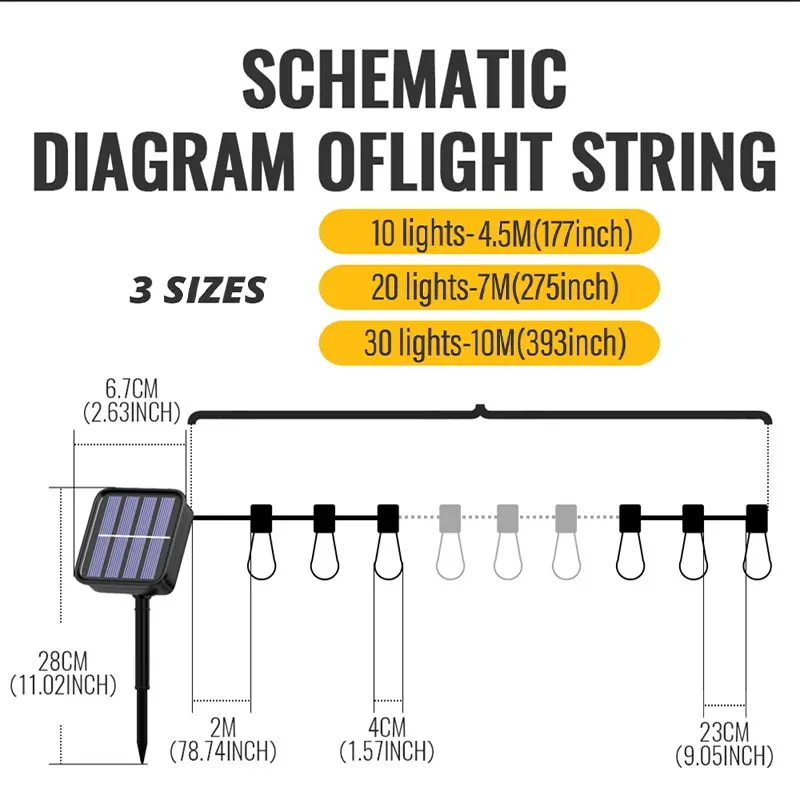 3.Installation flexibility makes it the best carnival light chain for weddings, birthdays and parties: place the solar panels anywhere with the included stakes and clips. Solar lights do not require sockets, so even spaces far away from buildings can be well lit. The loops on each bulb use hooks or wires-connect all bulbs to create a straight look, or just some loops for a fan-shaped look.