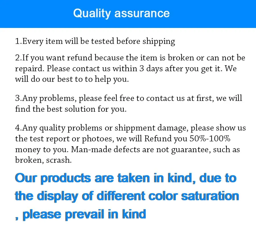 2. if there is any problem with the product or shipping, please contact with us freely, we will solve the problem for you within 24hours