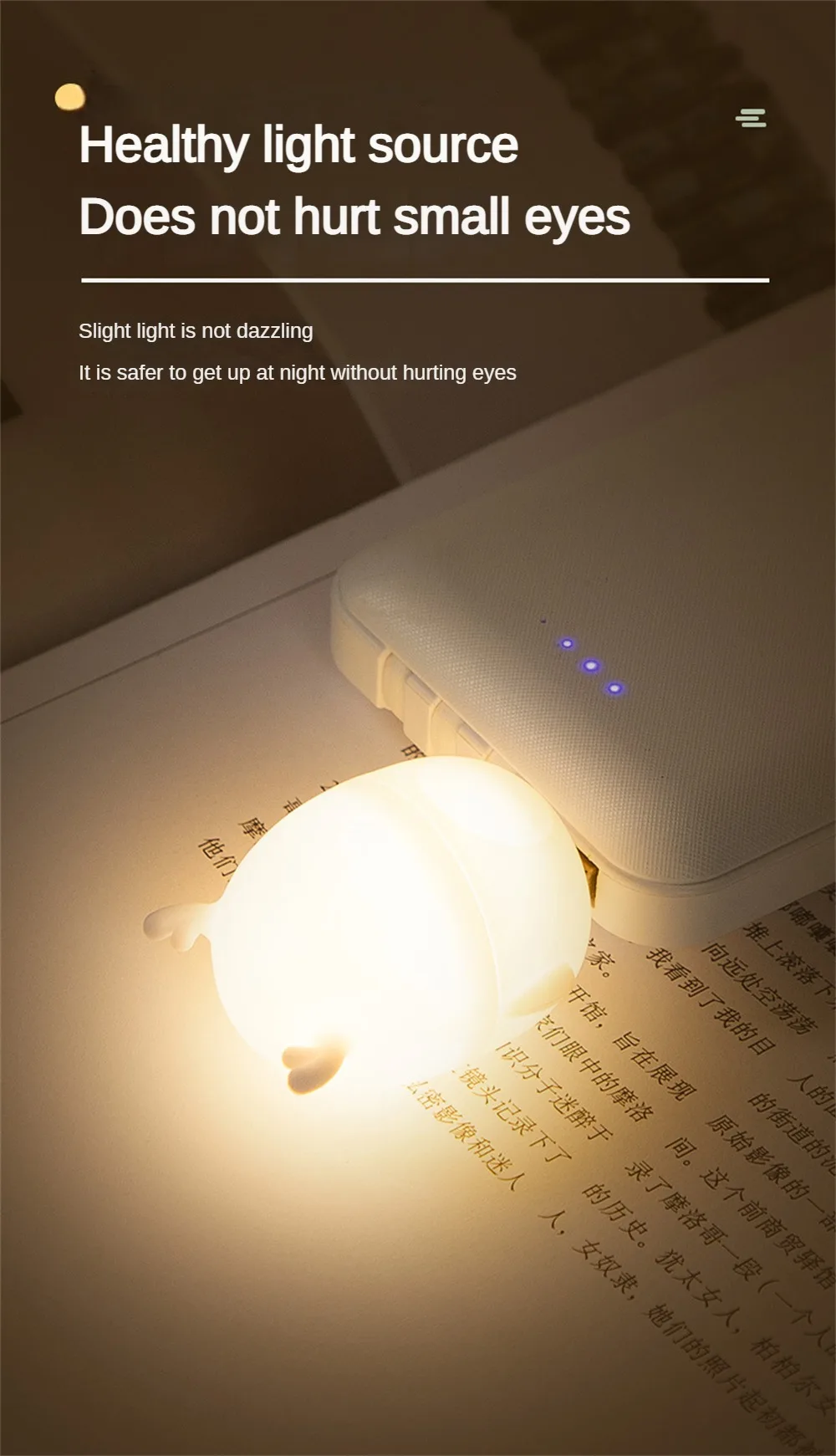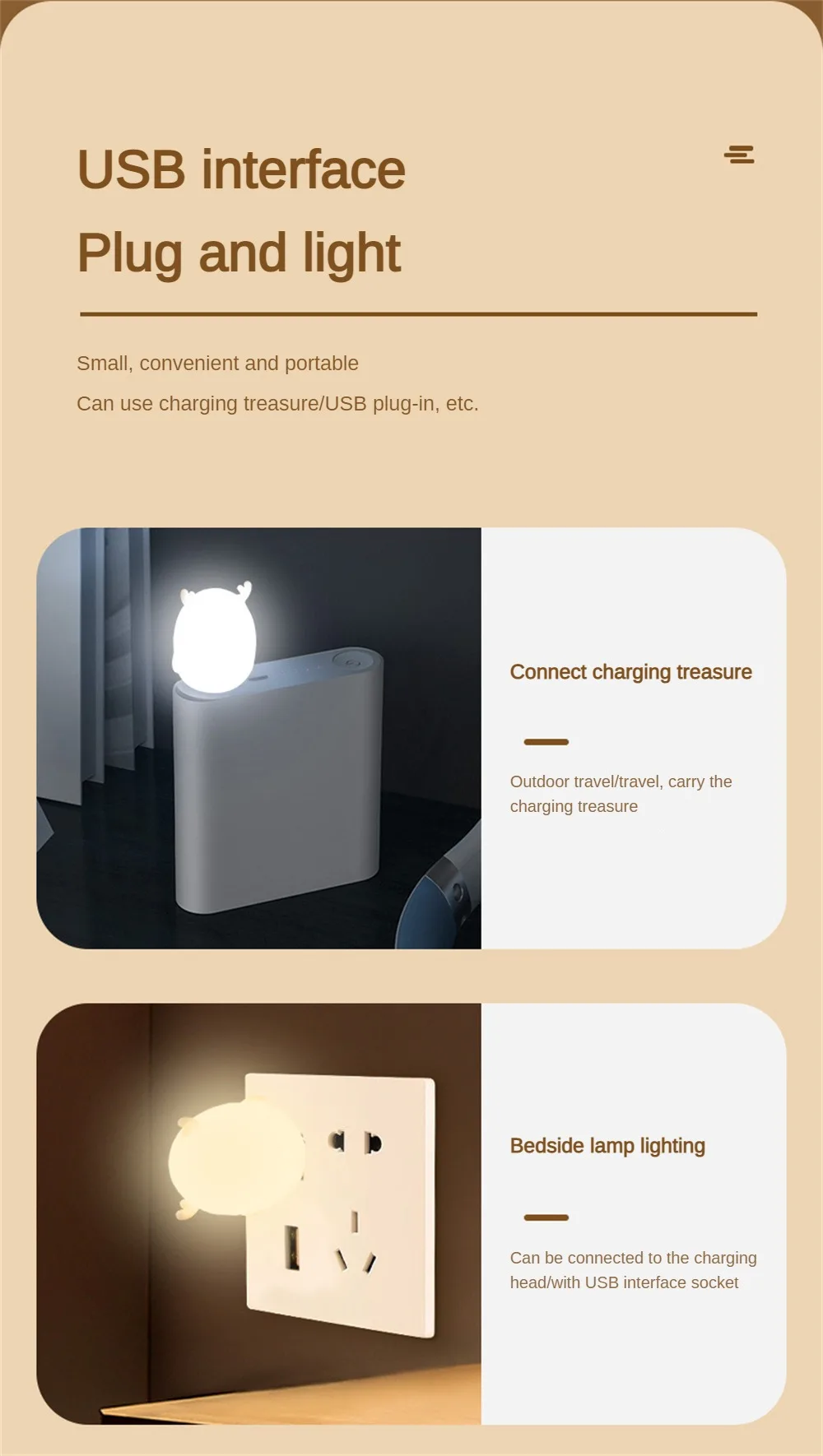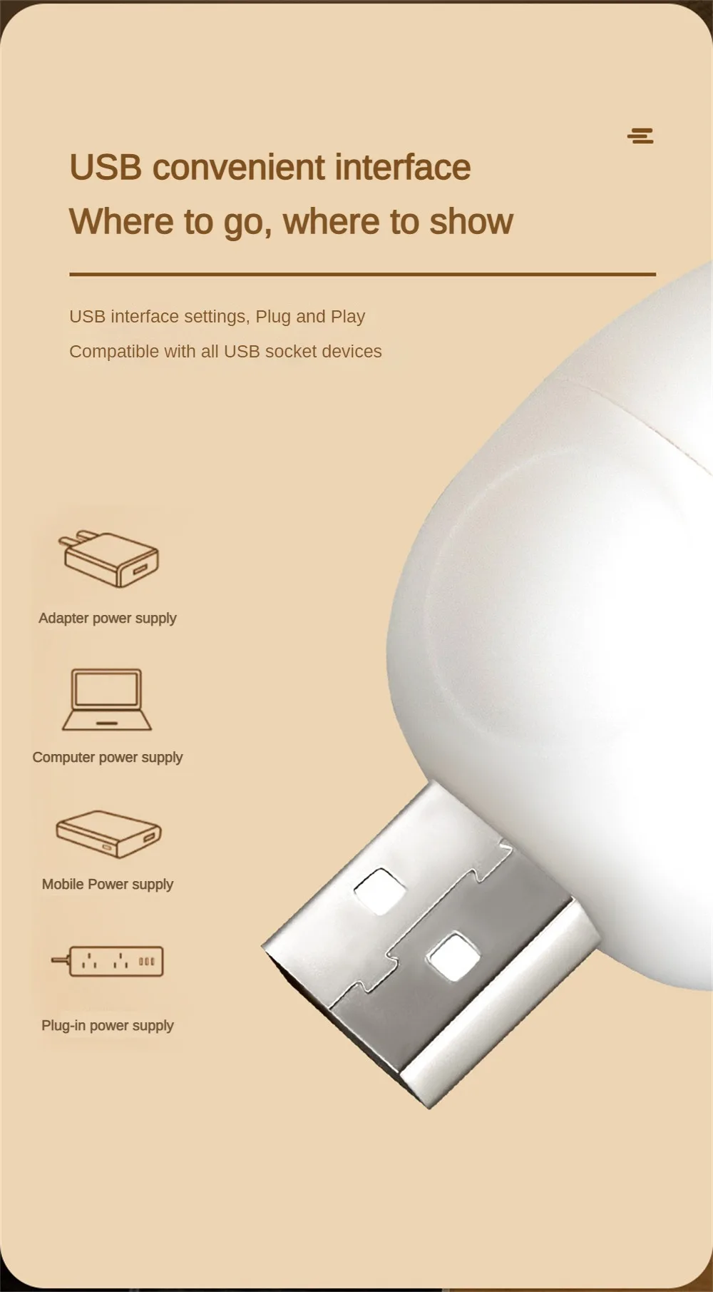 1.USB Plug in Night Light,you can plug it into any USB power sources, such as a mobile power source, laptop, PC, outdoor backpack, karaoke microphone, or any other device with a USB output port, stop by putting it out.