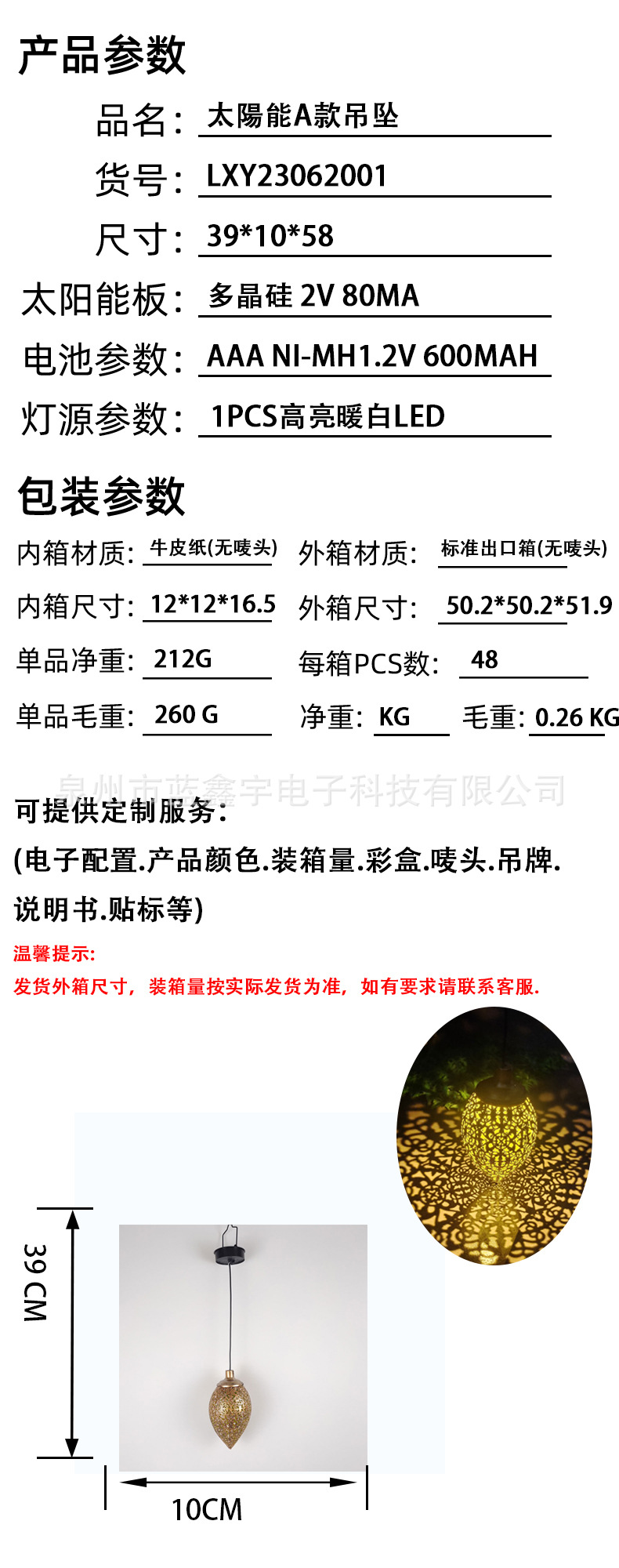 Model: LXY23062001 Phạm vi ứng dụng chính: Bãi cỏ biệt thự sân vườn ngoài trời Bằng sáng chế: Không Chứng nhận: Không Số đơn đặt hàng: LXY23062001 Chất liệu: Sắt mỹ thuật Chế biến tùy chỉnh: Có hoặc không Nguồn cung cấp đặc biệt cho xuất khẩu xuyên biên giới: Có Thời gian chiếu sáng liên tục: 6-12 giờ Xuất xứ: Phúc Kiến Mã hàng: LXY23062001 Nhãn hiệu: Hạt đèn khác ADA/Khác/Khác có thương hiệu riêng có thể được ủy quyền: Không Cho dù đó là là người nộp thuế chung: Không Công suất nguồn sáng: 0,05 Loại nguồn sáng: LED Cấp bảo vệ: IP55 Điện áp: 1.2v Kích thước: Mặt trời Mặt dây chuyền 39*10*58 Phong cách: Châu Âu Khu vực bán hàng chính: Châu Phi/Châu Âu/Nam Mỹ/Đông Nam Á/Bắc Mỹ/Đông Bắc Á/Trung Đông/Khác Có nên nhập khẩu: Không Loại: Đèn LED Sân vườn