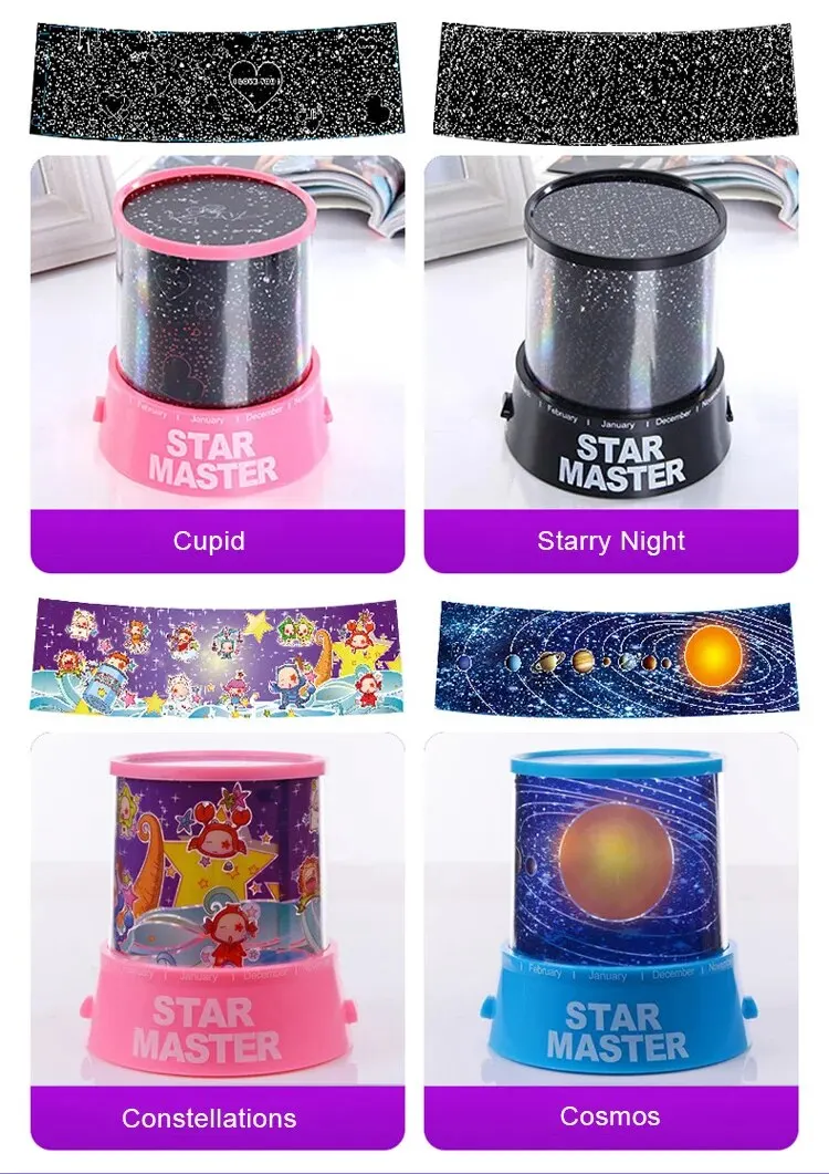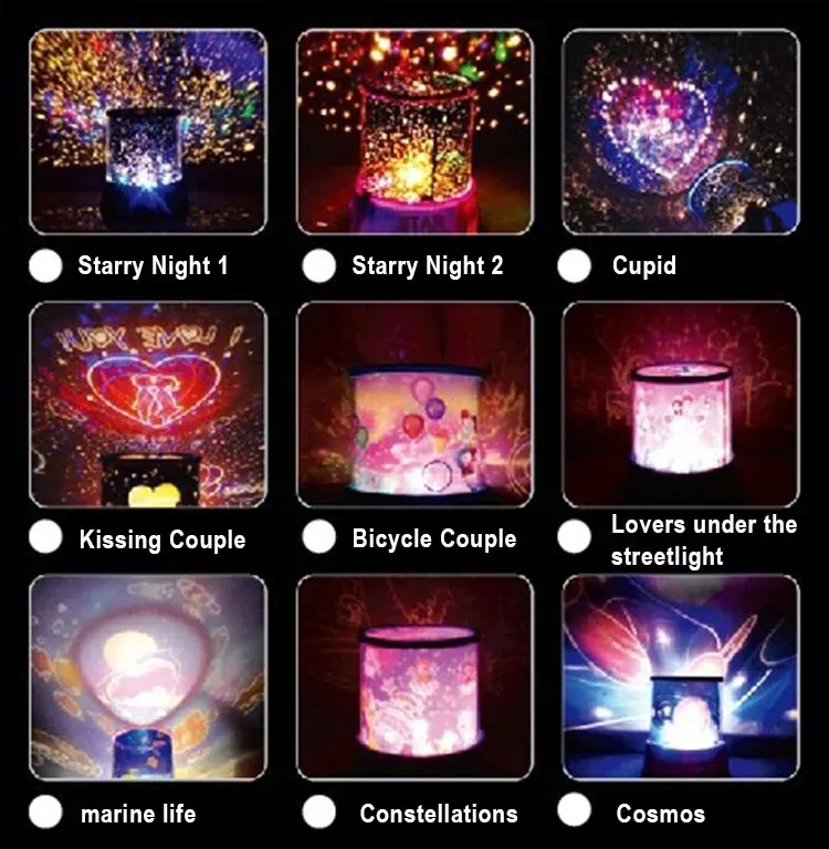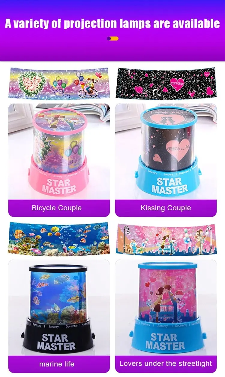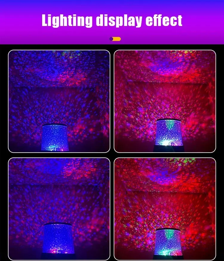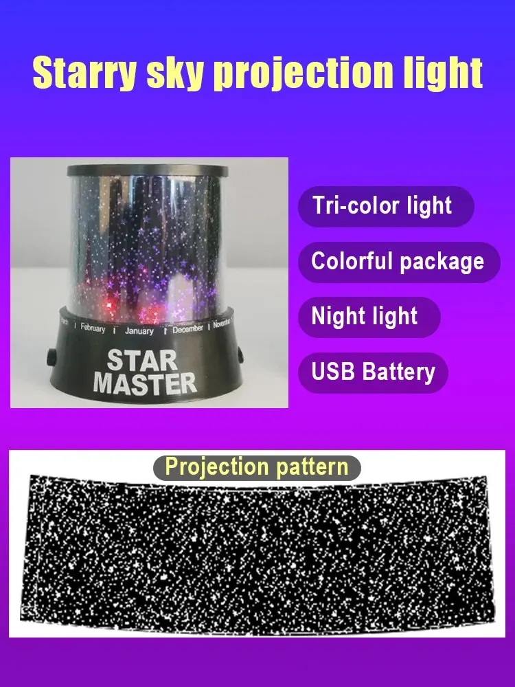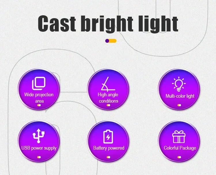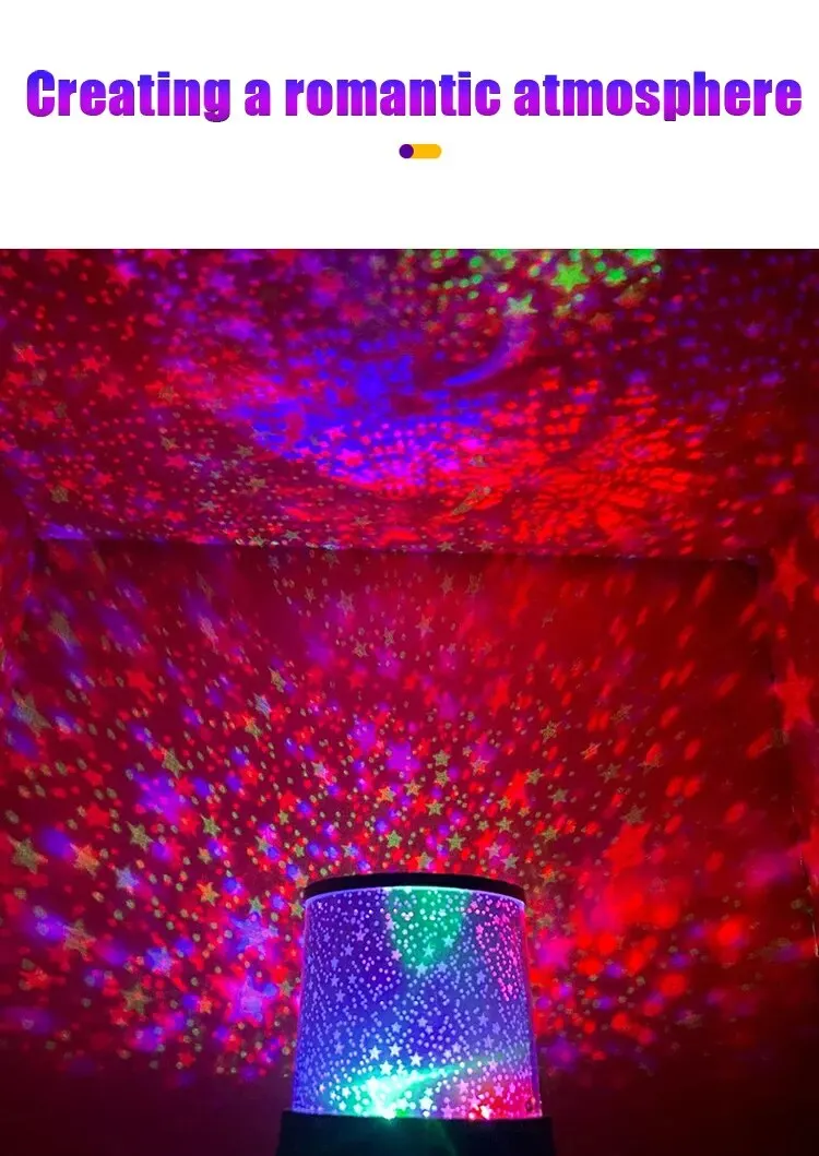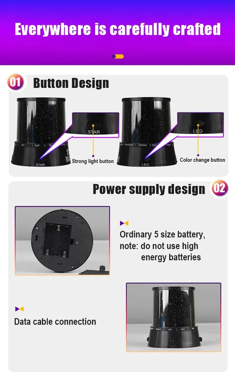 Two modes of power supply, USB/5 batteries, a variety of light colors, warm yellow light Three color-changing lights,Wider projection angle, multiple projection patterns