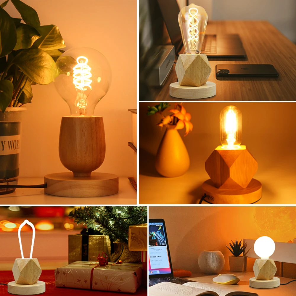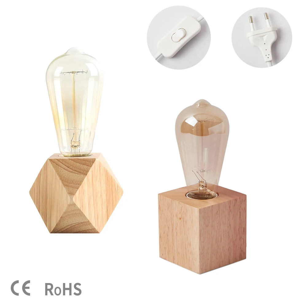 Retro Wood Table Lamp E27 Socket Vintage Desk Lamp Base Holder EU Plug Bedside Lamp Decoration Wooden Base Table Light 220V 110V