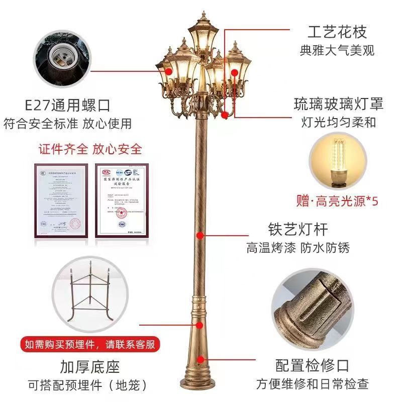 Mã số: TYD5001 Nhãn hiệu: Jiumingjiu Model: 9634 Bằng sáng chế: Không có Chứng nhận: Không có Người nộp thuế chung: Không Nguồn sáng Công suất: 5 * 30 Chất liệu: Nhôm Loại nguồn sáng: LED Cấp bảo vệ: P55 Điện áp: 220V Tùy chỉnh xử lý: Có Kích thước: Loại tiết kiệm 2,7m/Tiết kiệm năng lượng mặt trời 2,7m/Điện 3,2m/Năng lượng mặt trời 3,2m/Đui đèn lớn 4,2m/4. Mô hình năng lượng mặt trời giá đỡ đèn lớn 2m/ Mô hình năng lượng mặt trời đui đèn lớn 4,2m Phong cách: Châu Âu Thời gian chiếu sáng liên tục: 6 giờ (bao gồm) -12 giờ (không bao gồm) Có nhập khẩu hay không: Không Loại: đèn sân vườn năng lượng mặt trời