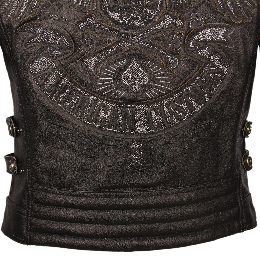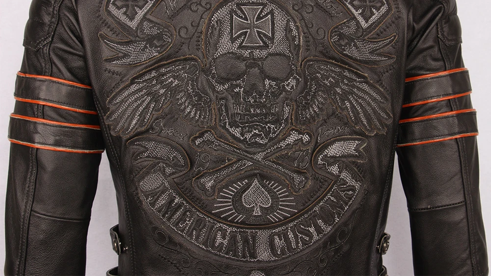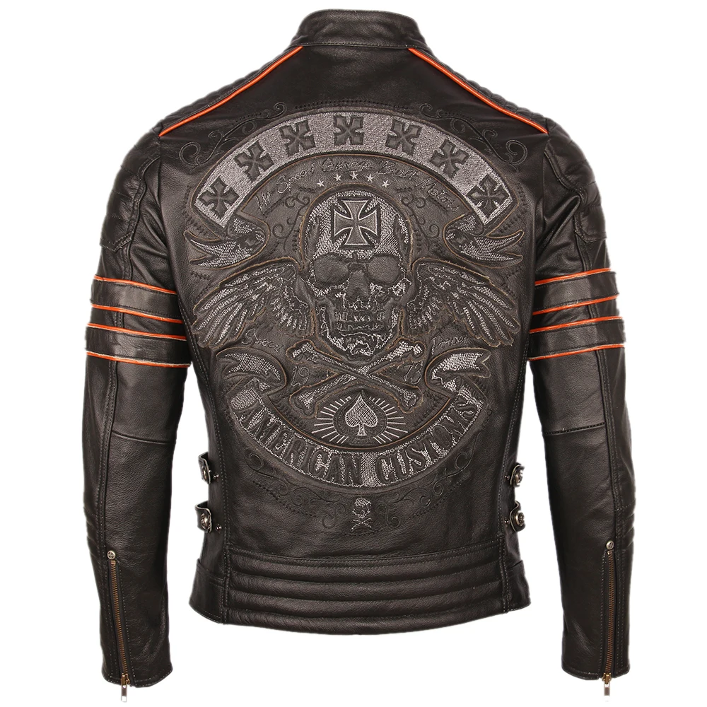 Đen Thêu Đầu Lâu Xe Máy Áo Da Da Bò Tự Nhiên 100% Moto Áo Khoác Biker Áo Khoác Da Mùa Đông Quần Áo Ấm M219