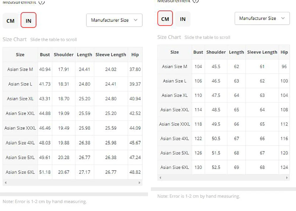 1. All measurements are in CM with 1-2cm measurment tolerance