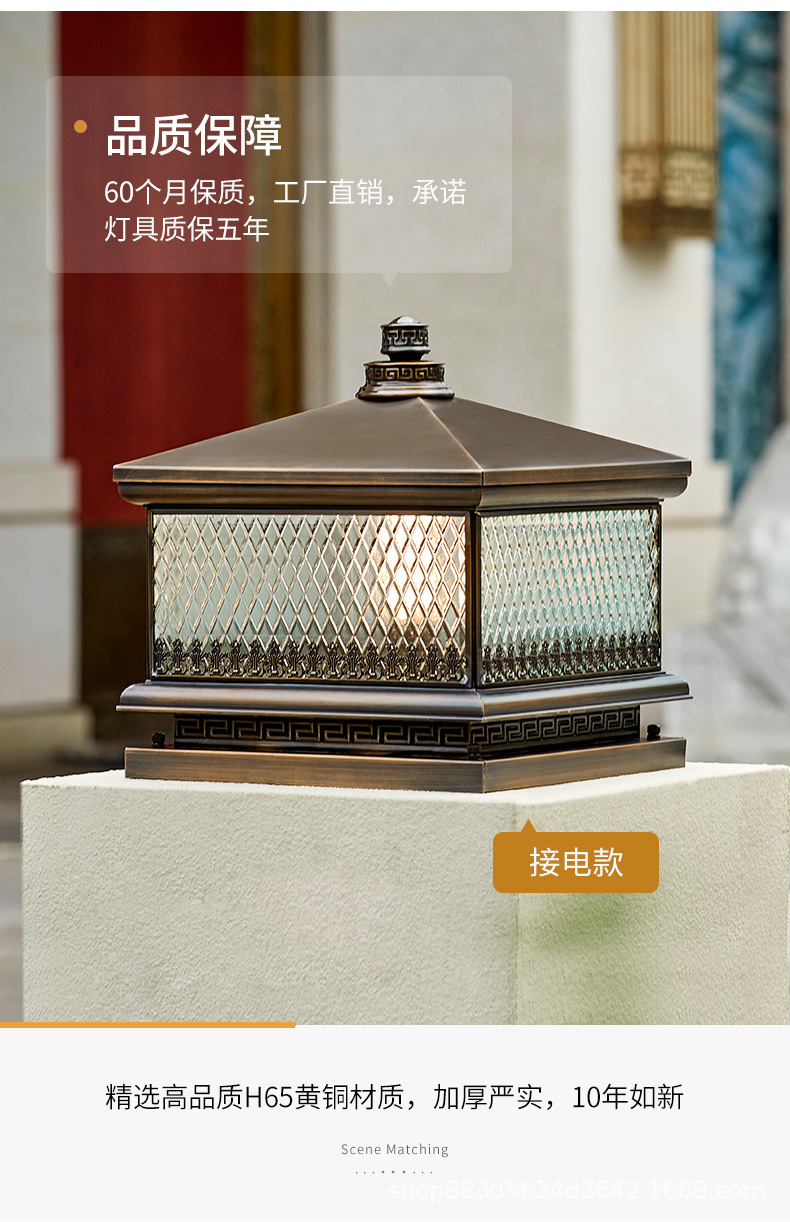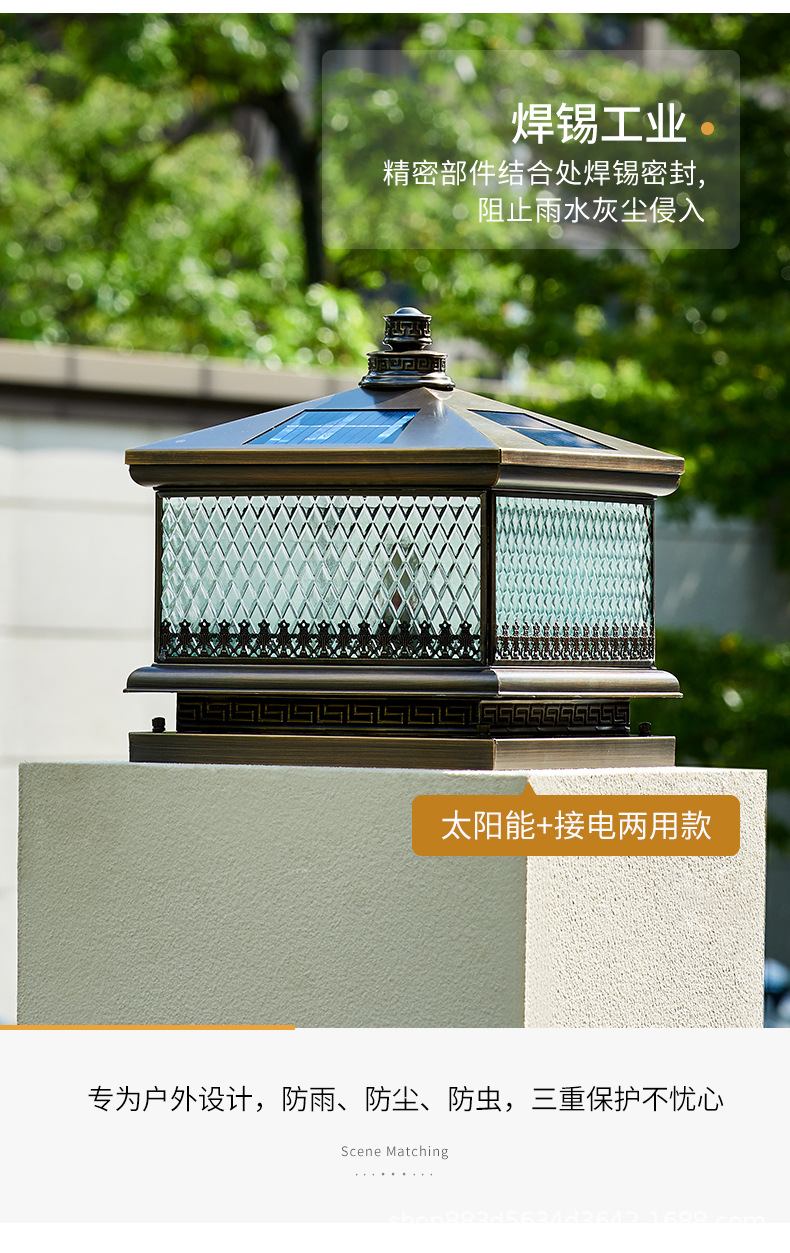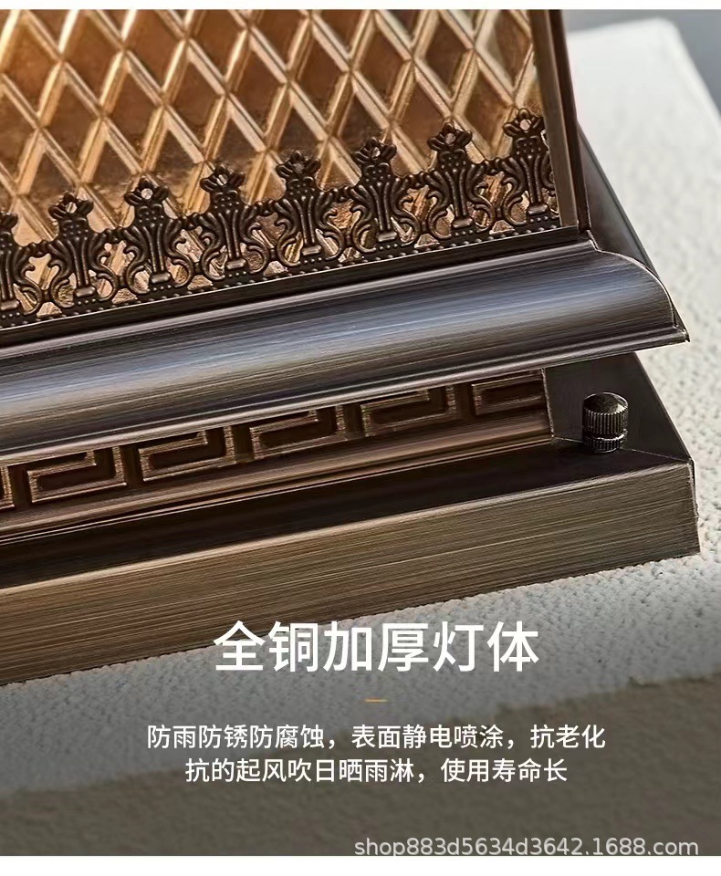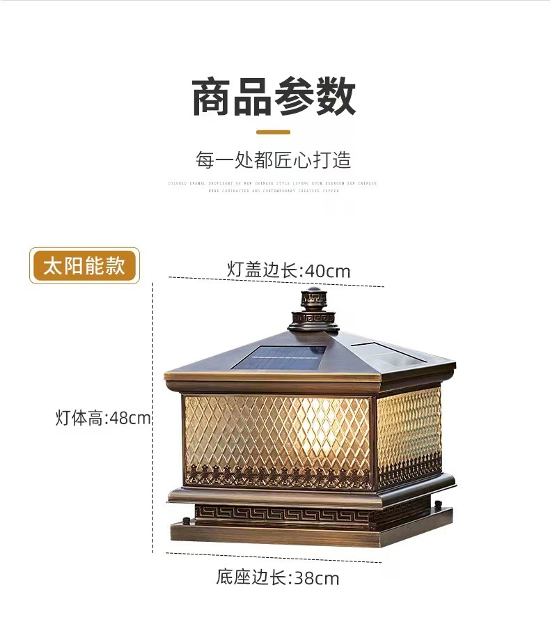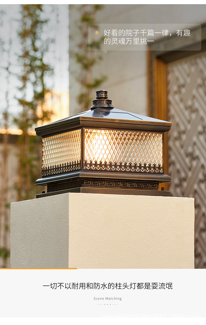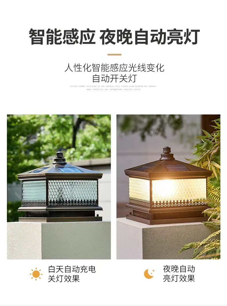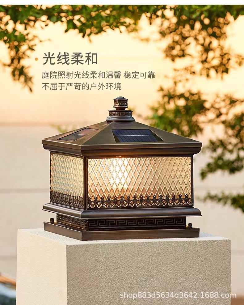 Đèn trụ cột năng lượng mặt trời hoàn toàn bằng đồng kết nối với điện ngoài trời cổng trụ chống nước đèn cổng biệt thự đơn giản đèn tường sân vườn