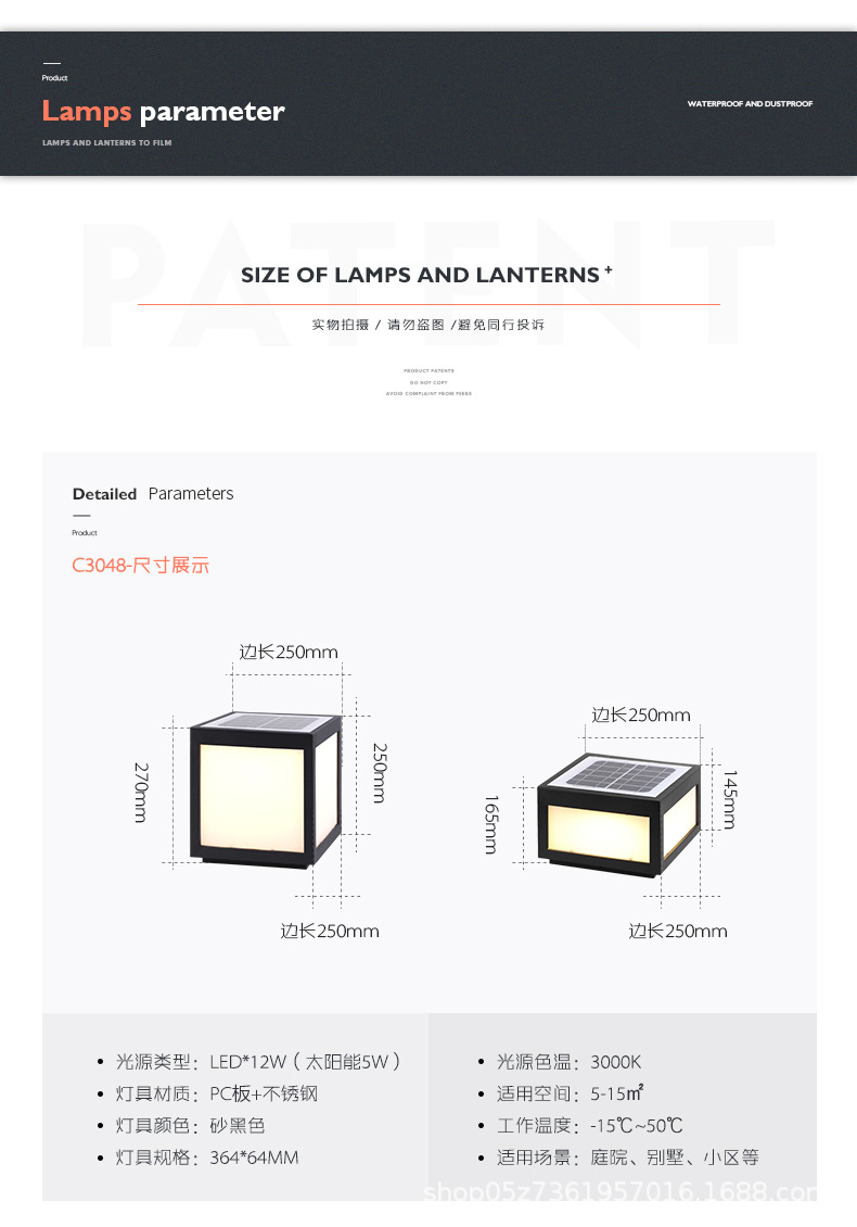 Đèn cột, đèn sân vườn ngoài trời, đèn trụ cổng năng lượng mặt trời, đèn trụ cửa biệt thự, đèn tường hàng rào, đèn sàn sân vườn. Quý khách có nhu cầu mua Đèn ngoài trời nhập khẩu vui lòng liên hệ với chúng tôi để được tư vấn hỗ trợ. Dịch vụ mua hàng Trung Quốc sẽ hỗ trợ quý khách mua hàng từ nhà cung cấp và giao tới tận tay quý khách hàng..Nơi xuất xứ: Thành phố Trung Sơn, tỉnh Quảng Đông Thương hiệu: Giá khác Mô tả: Chưa bao gồm thuế Model: C3048 Phạm vi áp dụng chính: Sân biệt thự, công viên, cộng đồng, khách sạn và các cảnh ngoài trời khác Có bằng sáng chế hay không: Không Chứng nhận: Không Có hay không là người nộp thuế thông thường: Không có Nguồn sáng Công suất: LED*8W Chất liệu: Thép không gỉ Loại nguồn sáng: LED Cấp độ bảo vệ: IP54 Điện áp: 220v Tùy chỉnh xử lý: Không Kích thước: C3048-nhôm đúc-25CM-màu xám flash-kiểu ngắn- năng lượng mặt trời/C3048-nhôm đúc-30CM-màu xám flash -Mẫu ngắn-Mẫu điện/C3048-Nhôm đúc-30CM-Màu xám flash-Mẫu ngắn-Mặt trời/C3048-Thép không gỉ-40CM-Màu xám flash-Mẫu ngắn- Solar/C3048-Nhôm đúc-25CM-Xám flash-Mẫu cao- Model kết nối điện/C3048-Nhôm đúc-30CM-Xám flash-Mẫu cao-Mẫu kết nối điện/C3048-Thép không gỉ-40CM-Xám flash- Model cao-Mô hình kết nối điện/Mẫu C3048-L Mạ kẽm-25CM-Mô hình ngắn-Mô hình kết nối điện Điện/Mô hình C3048-L mạ kẽm-Mô hình 25CM-Mô hình ngắn-năng lượng mặt trời/Mô hình C3048-L mạ kẽm-30CM-Mô hình ngắn-điện/C3048 -Mô hình L mạ kẽm-30CM-mô hình ngắn-năng lượng mặt trời/Mô hình C3048-L mạ kẽm-Mô hình cao 25CM-kết nối với điện/Mô hình C3048-L mạ kẽm-mô hình cao 25CM-năng lượng mặt trời/Mô hình C3048-L mạ kẽm-cao 30CM model-kết nối với điện/model C3048-L mạ kẽm-30CM-model cao -Mặt trời/C3048-L loại mạ kẽm-40CM-Loại cao-Điện/C3048-L loại mạ kẽm-40CM-Loại cao-Mặt trời/C3048-L loại mạ kẽm -25CM-Loại ngắn-Mặt trời (cháng đèn)/ Model C3048-L mạ kẽm-30CM-model ngắn-nối nguồn (chụp đèn dạng sóng)/Mẫu C3048-L mạ kẽm-model ngắn 30CM-năng lượng mặt trời (chụp đèn dạng sóng)/C3048 -L model mạ kẽm-30CM-model ngắn-năng lượng mặt trời (Chao đèn dạng sóng) Kiểu dáng: Đơn giản, hiện đại Thời gian chiếu sáng liên tục: 6-12 giờ Dù nhập khẩu: Không Loại: Đèn LED sân vườn