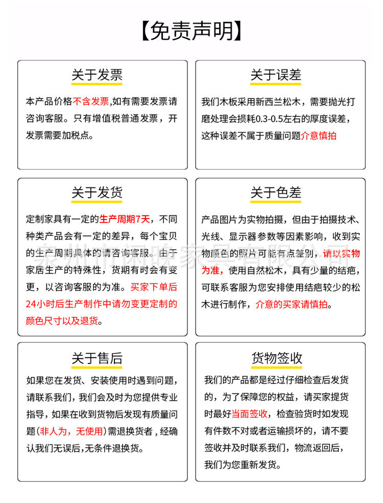 温馨提醒:本厂发货前对每一票货物都有买货值保险,收货时,请当快递员的面拆包验货检查箱子或快递包外包装及封条是否完整,请当场验货后确认无误在签收,如产品破损,请不要正常签收,要叫物流做异常签收并写上外包装破损,然后第一时间反馈给我厂,签收后出现运输问题我们无法处理!(家具属于大件物品,非质量问题不接受退换货哦) 再次感谢亲的支持!