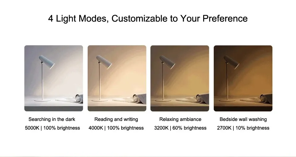Short press to turn on/off the light, long press to adjust among 4 light modes. The color temperature and brightness change simultaneously, providing a touch-controlled solution for diverse lighting scenarios.